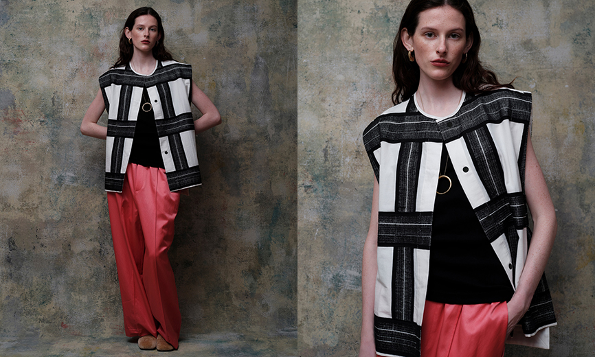 チェックジャカードの上から異素材のテープを叩きつけ、インドらしいクラフト感のあるオリジナル生地を使ったジレ。ノーカラーのミニマルなデザインでモダンさも感じられる一着。
