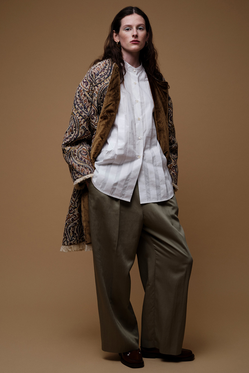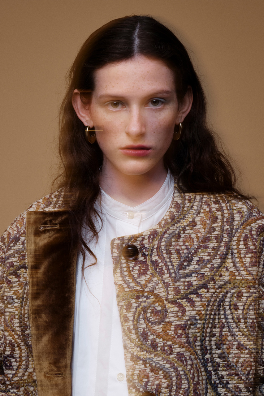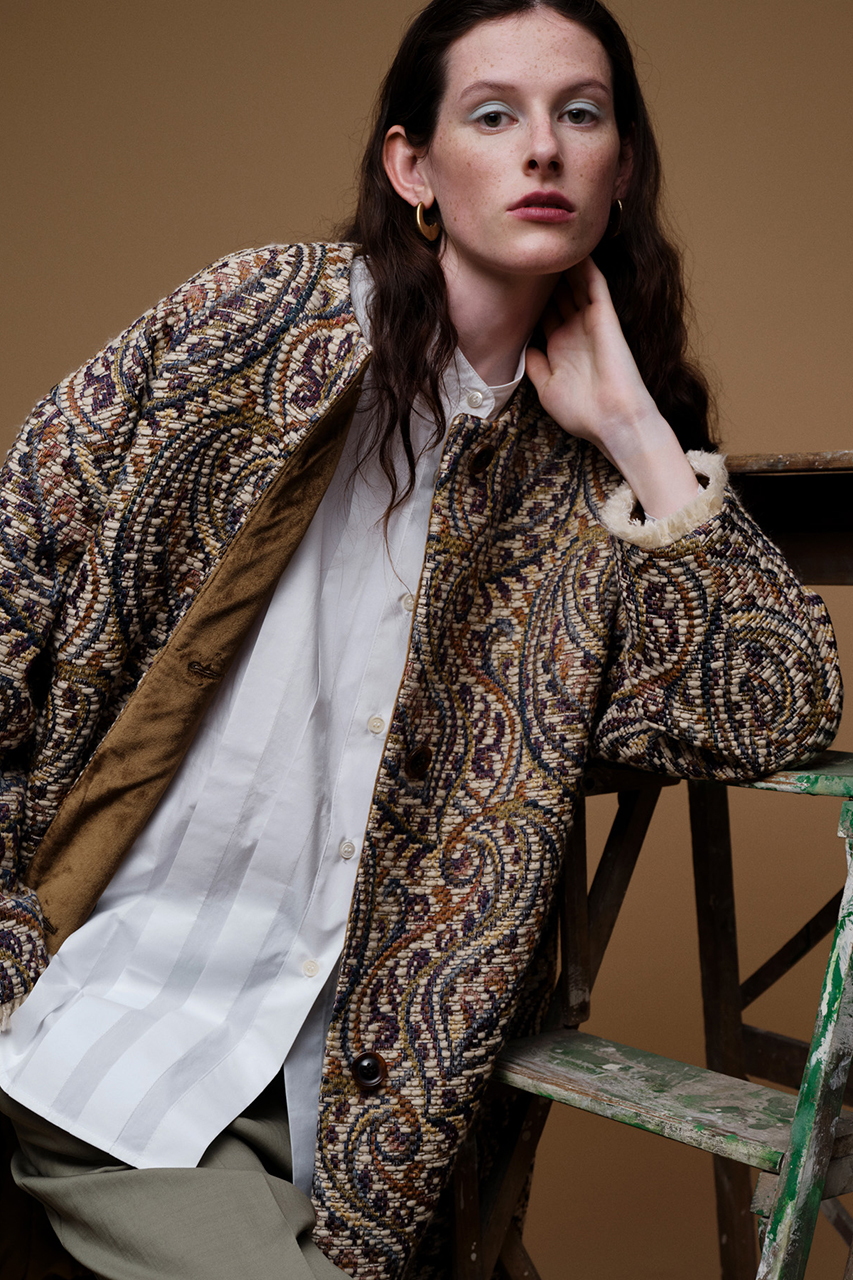 多彩な色が重なり、深みと奥行きのあるジャカードがアンティークのような美しさをまとうスペシャルなコート。程よくゆとりのあるコクーンシルエット。内側の見返しにはベロアをあしらい、細部にまでこだわりました。シャツ×パンツのマニッシュな着こなしに華を添えます。