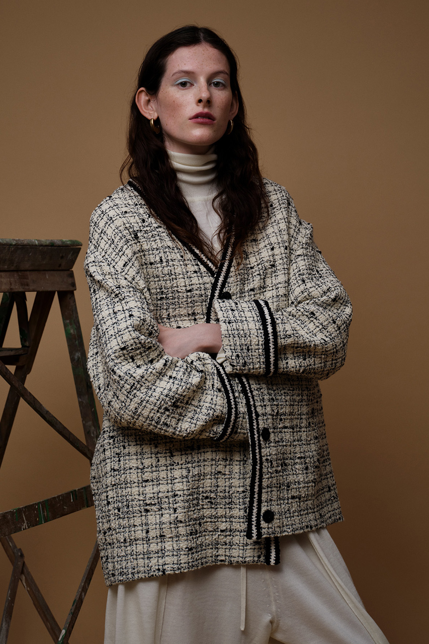 クラシカルなツイードジャケットをモダンに解釈。Vネック×オーバーサイズシルエットでコンサバになりすぎず、ラフに着崩すのが“今”の気分。襟・袖口に利かせたブレードとスナップボタンをすべて黒で統一し、全体を引き締めました。