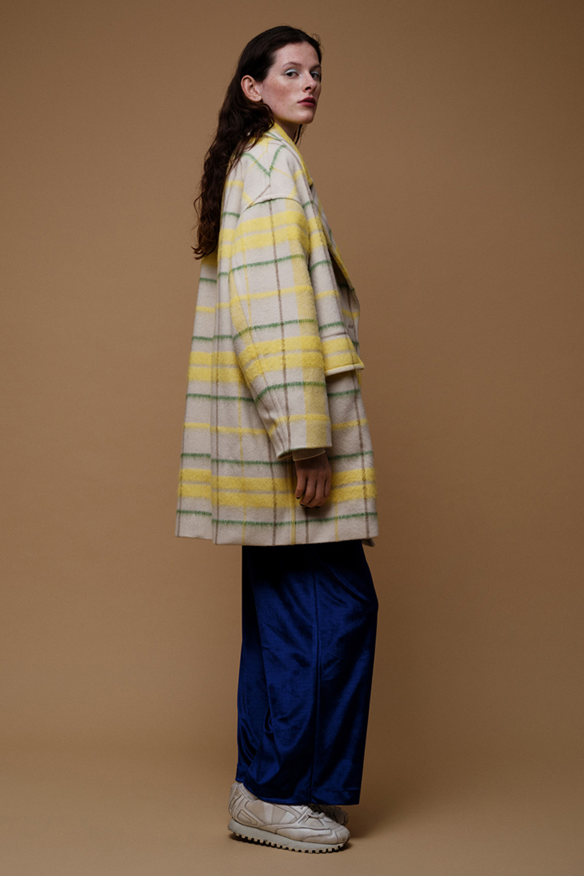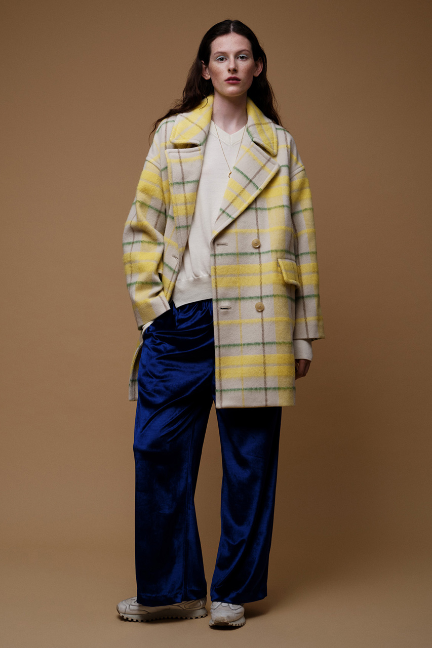 柔らかなライトベージュをベースにイエローとグリーンを利かせた、「ハウス オブ ロータス」オリジナルのシャギーチェック素材。あたたかな空気に包まれているような優しい着心地。光の当たり具合によってニュアンス違いの表情を見せてくれるベロアパンツは、鮮やかなブルーがスパイスとなってプレイフルな装いに。