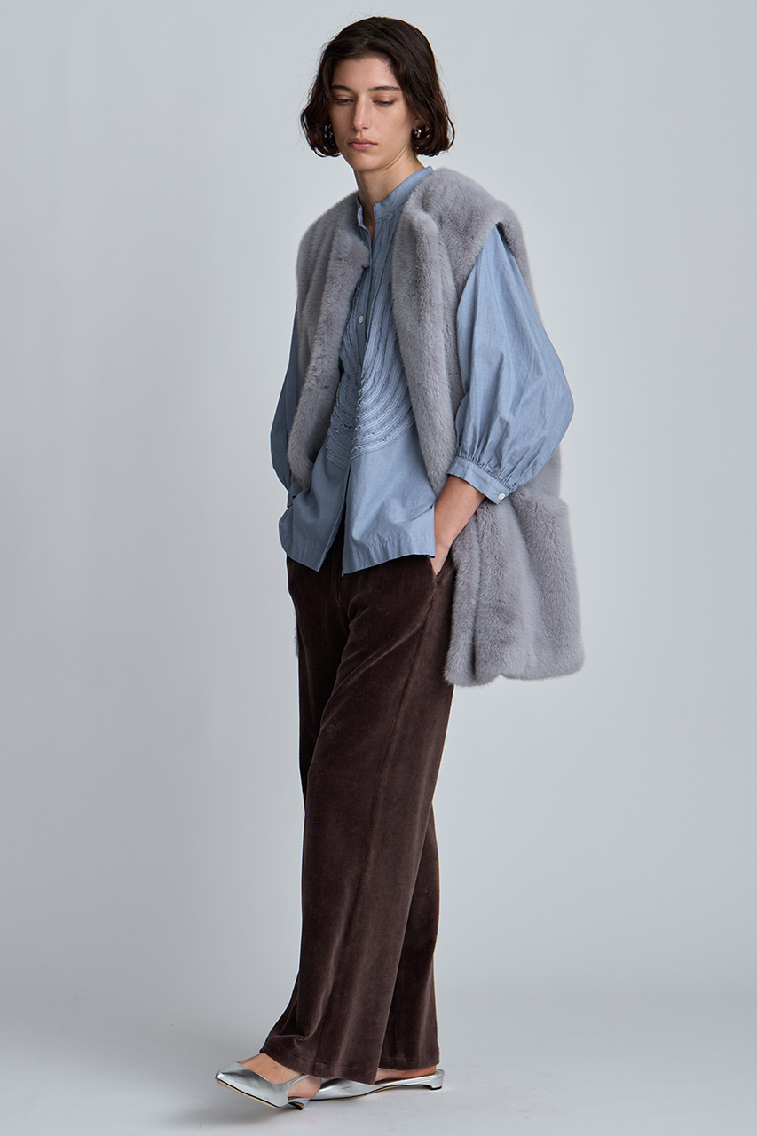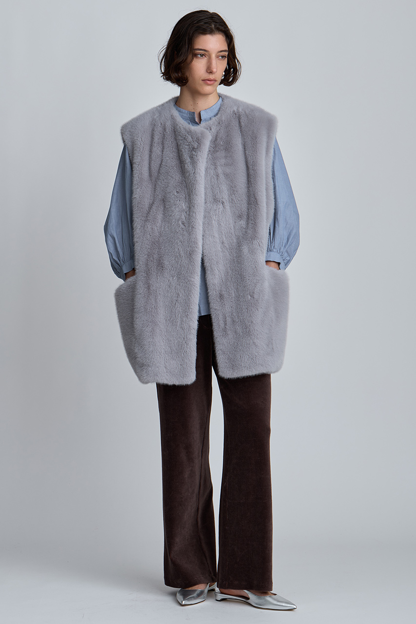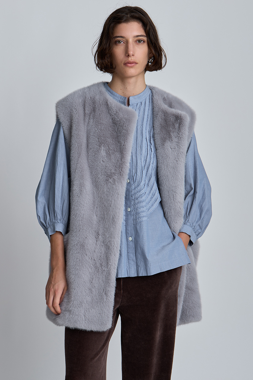 高級感のあるフェイクファーを贅沢に使用したジレ。上品な艶とボリュームが魅力。バサッと羽織って決まるラフさがこなれ感のある着こなしに。ブルーグレーの絶妙な色合いが洒落感をアップしてくれます。