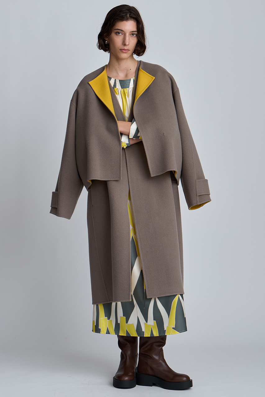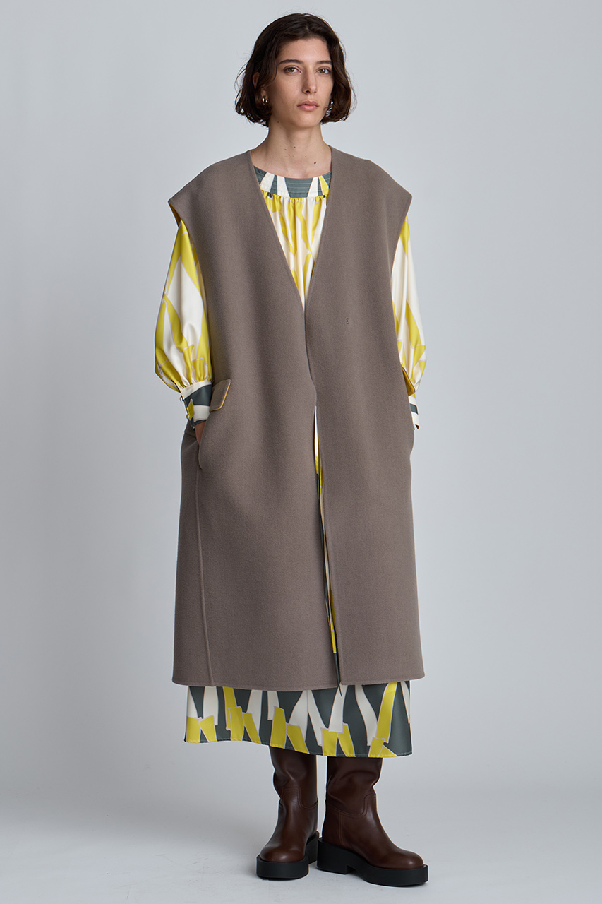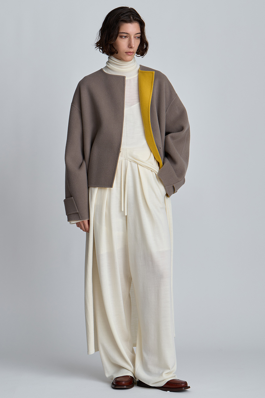 アウター×アウターの新しいレイヤードスタイル。定番のリバーコートは大胆なモカ×イエローの配色で個性を演出。ショートコートとジレはそれぞれ単品でも活躍してくれます。