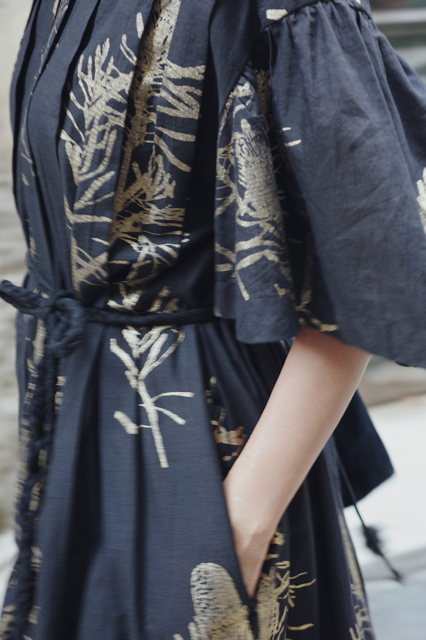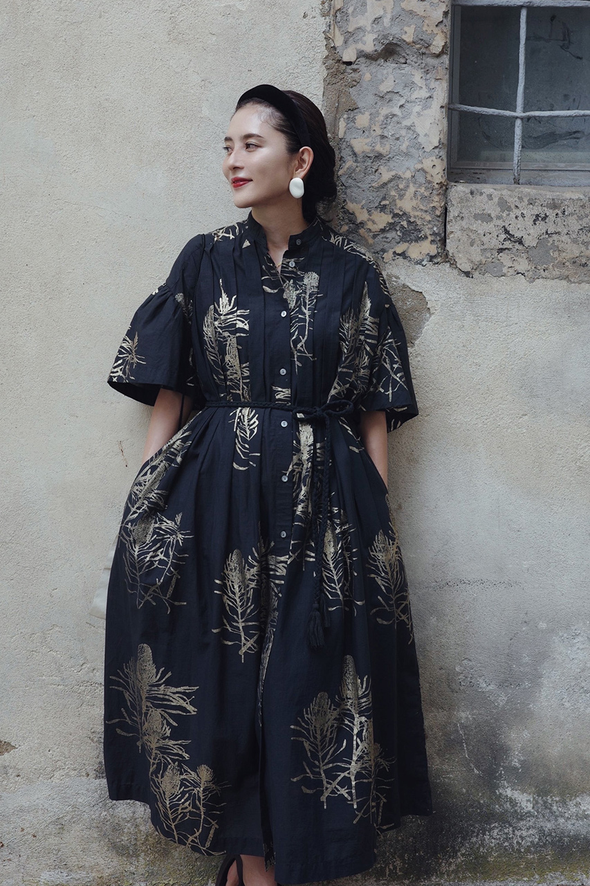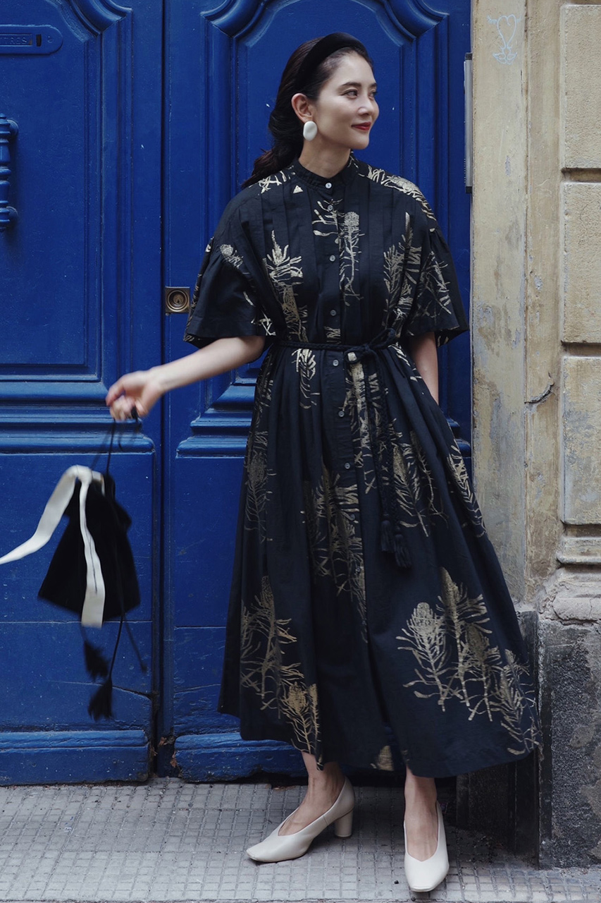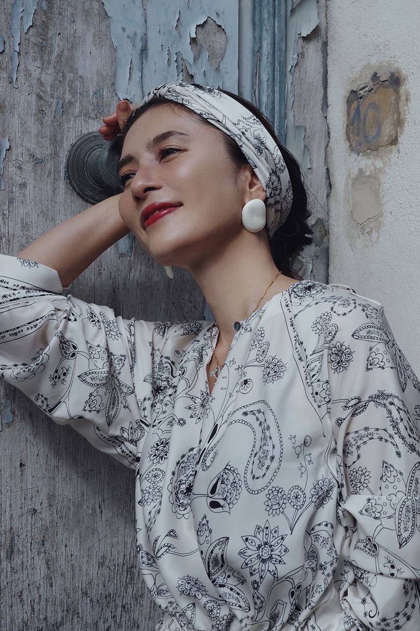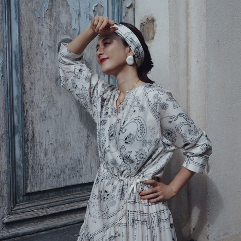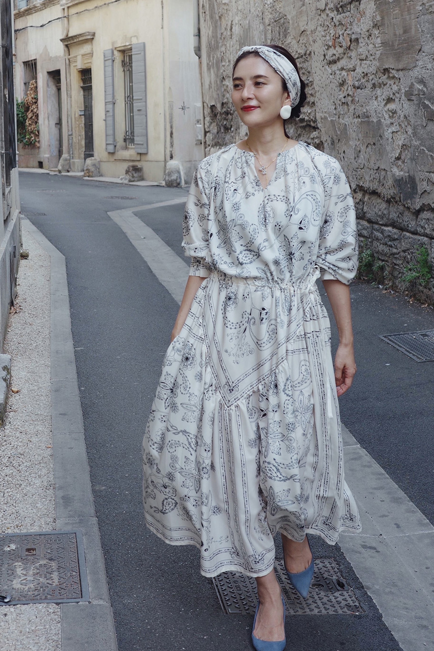 「今も昔も、ワンピースはエレガンスの代名詞。 組合せに悩むことなくその一枚でサマにもなるから 旅にもちょっとした日常にも重宝しますよね。 中でもクラシカルな柄やデザインが好みの私が選ぶのは、 こんな風に動くたび表情を変える軽やかな素材感。 肩肘張って見えずどんな場にも馴染んで、こなれた雰囲気に。 フランスでも何人もの方に褒めていただいた2枚です」。