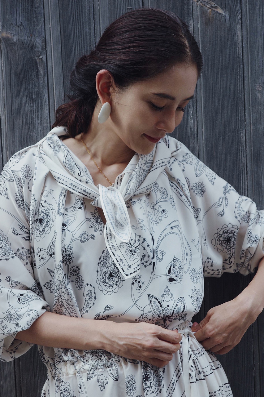 「首元やウエスト、頭と色々なところに巻いて遊べる付属のスカーフ。ドローストリングの調整でシルエットを自在にアレンジ。ストンと着るのも素敵だけど、私はウエストをキュッと絞るのが気分」。