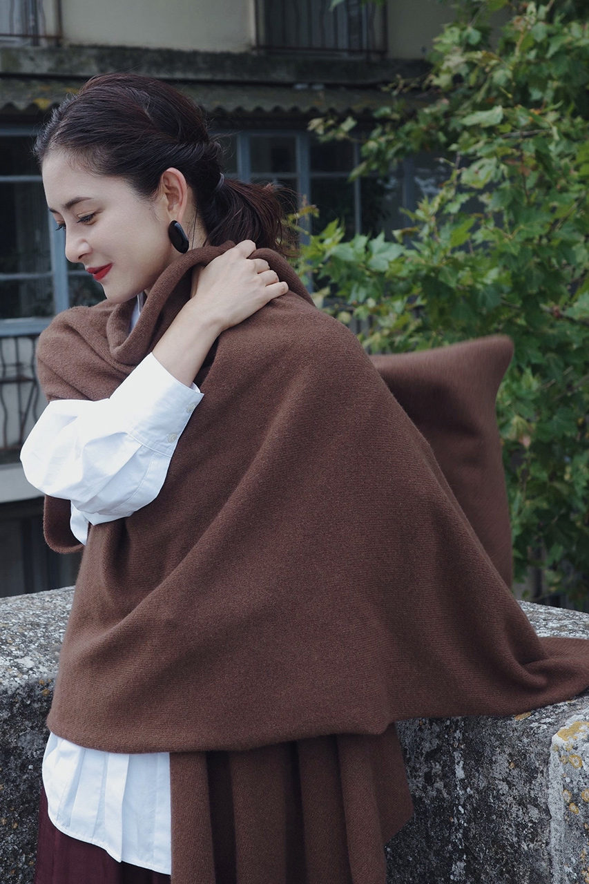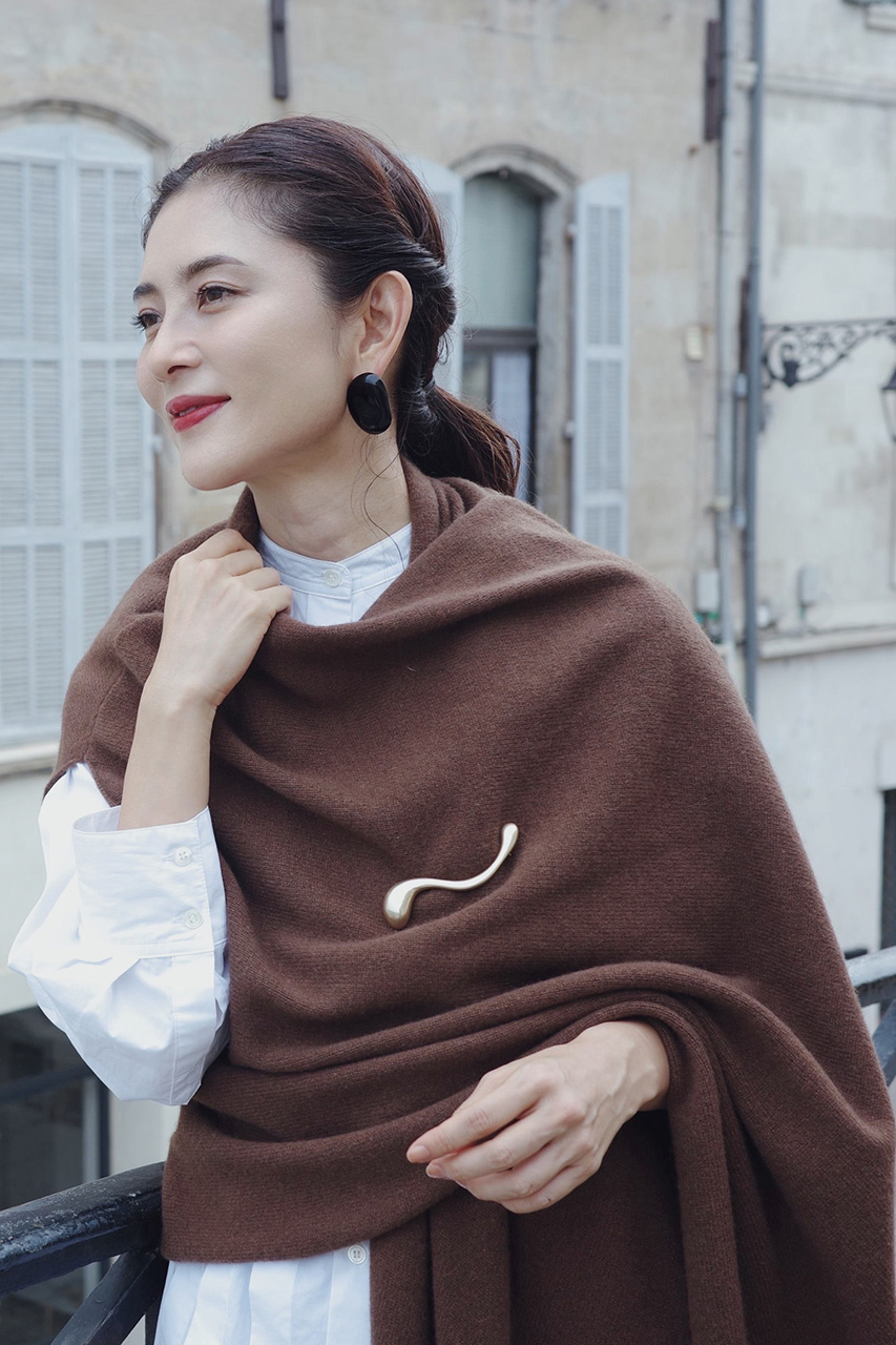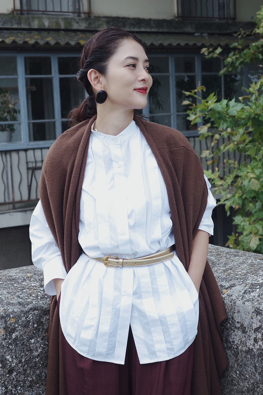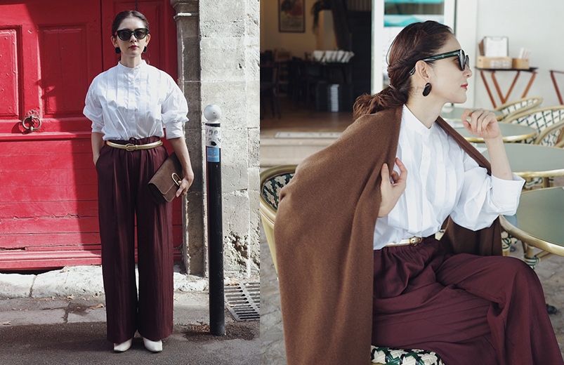 「特に秋のシーズン、国内外問わず、旅をするときに 毎回気分高まるのはハンサムなムード。 秋の空気感の中で小粋に映える気がするんです。 今回もシャツにパンツ、という装いを。 プリーツ仕立てやバーガンディカラーなど、 ベーシックをひとひねりしたアイテムでアップデート。 秋が深まったらストールを巻き、ドラマティック仕立てに」。