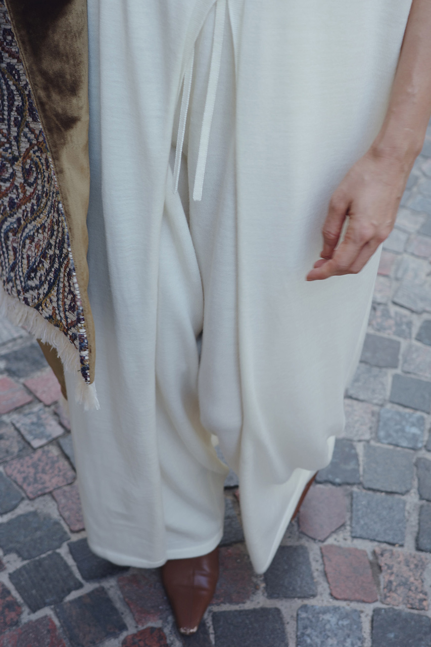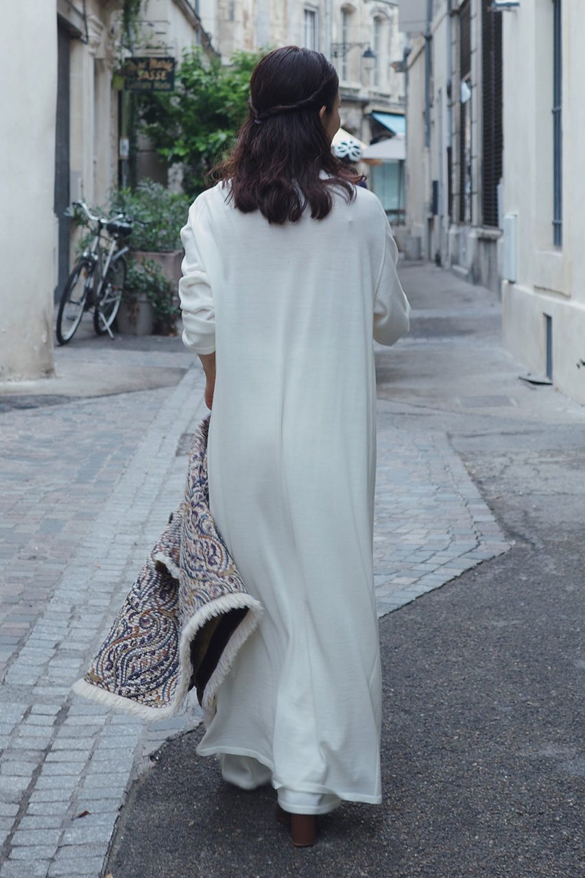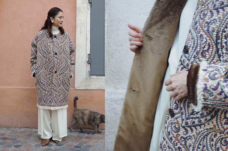 「シルエットはノーブルでクラシカルなのに 色や柄に存在感がある、私はいつもそんなバランスの虜。 そしてそれは品のある垢抜けに繋がる、と私は信じています。 今回は、展示会で一目惚れした 存在感たっぷりのアイテム同士をコーディネート。 全身白の優雅なセットアップに、手の込んだ美しいコート。 誰もが凛と華やかな面持ちになれる黄金コンビです」。