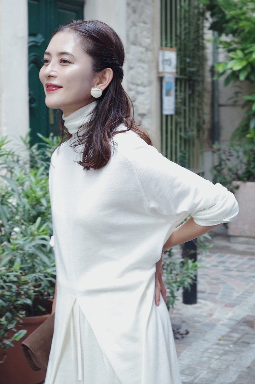 「センタースリット入りのロング丈ハイネックが新鮮。薄手なので歩くと優雅に揺れるのも魅力ですね」。