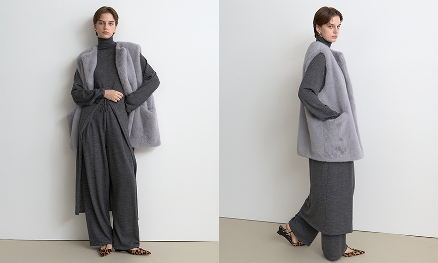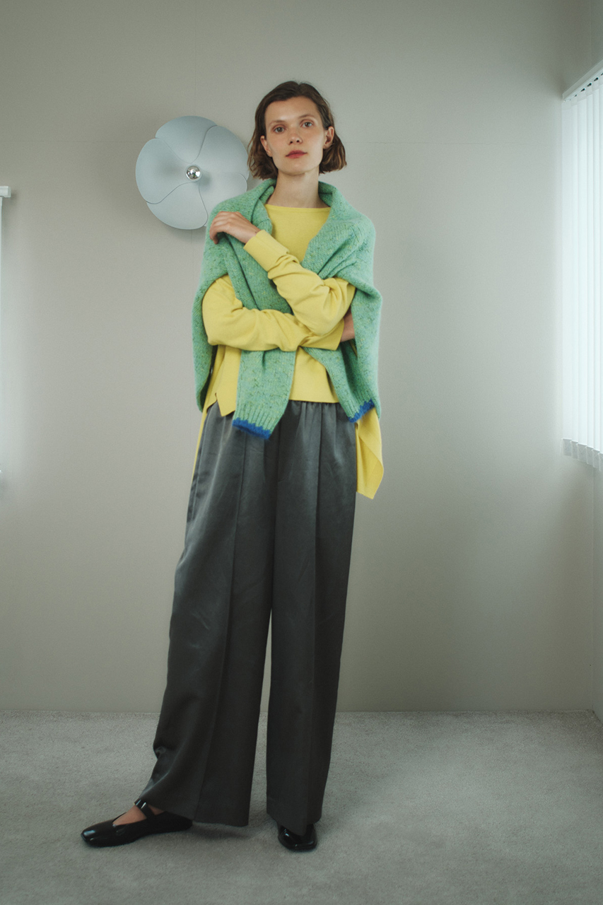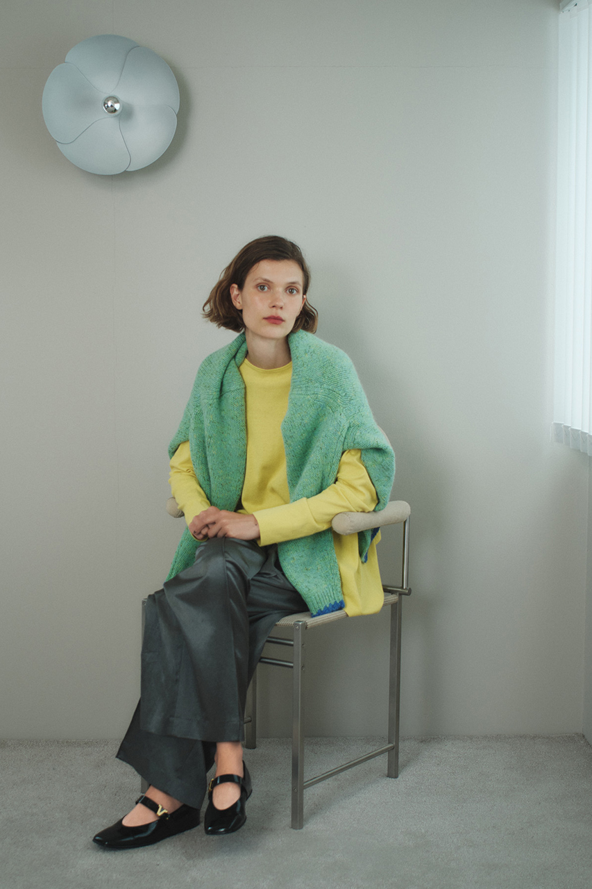 リラクシーな着心地とラグジュアリーを両立させたニットセットアップ。上質なメリノウールは素肌に着てもチクチクしにくく、快適な着心地。フロントに深く入ったワンピースのスリットが動くたびに揺らめき、佇まいを印象的なものに。複数のグレートーンを重ねることで新鮮な表情が生まれます。
