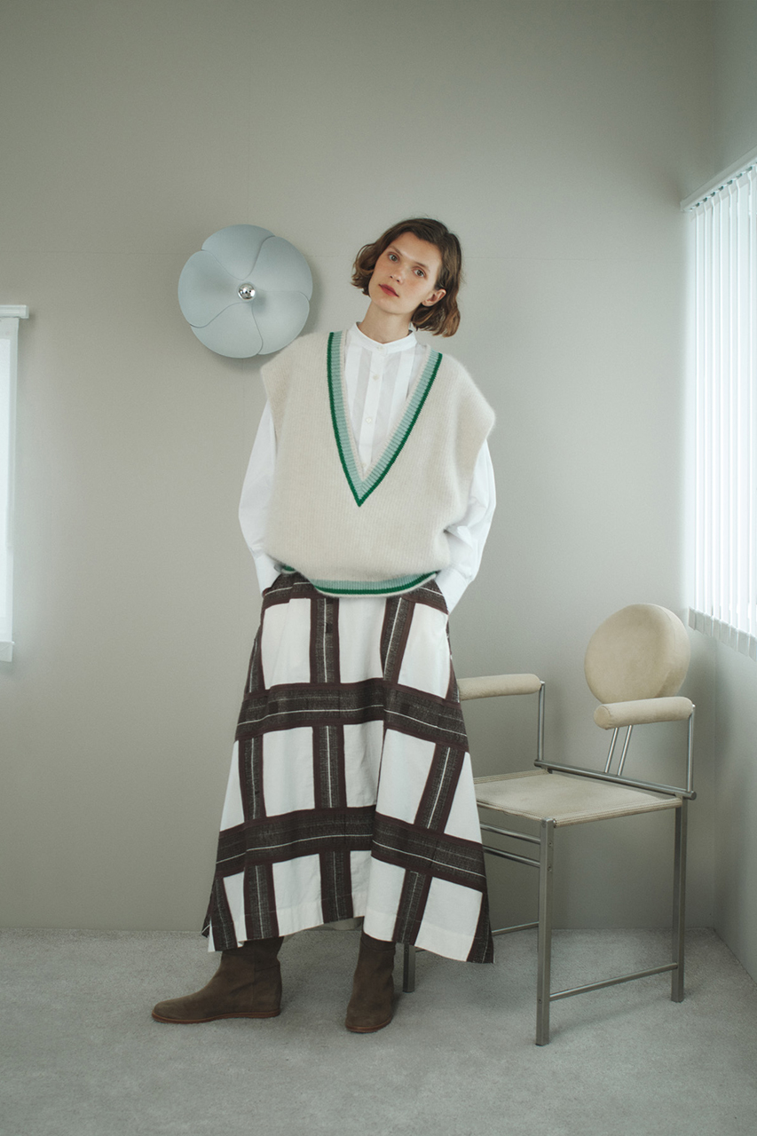 トラッドな印象のチルデンニットベストを起毛感のあるフォックスファーでつくることで大人の女性にふさわしい仕上がりに。オフホワイトにグリーンをきかせた個性が光る配色で遊び心をプラス。
