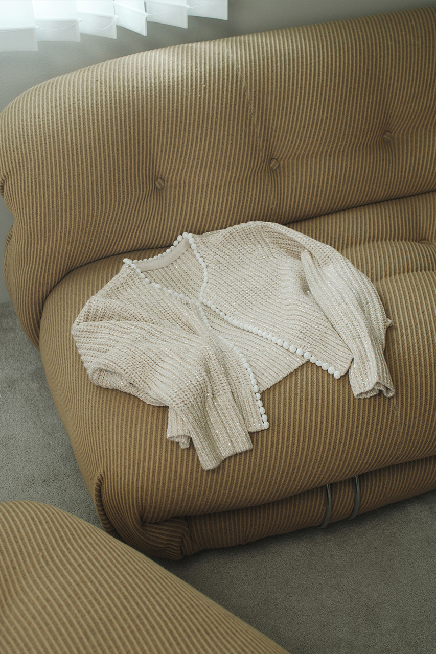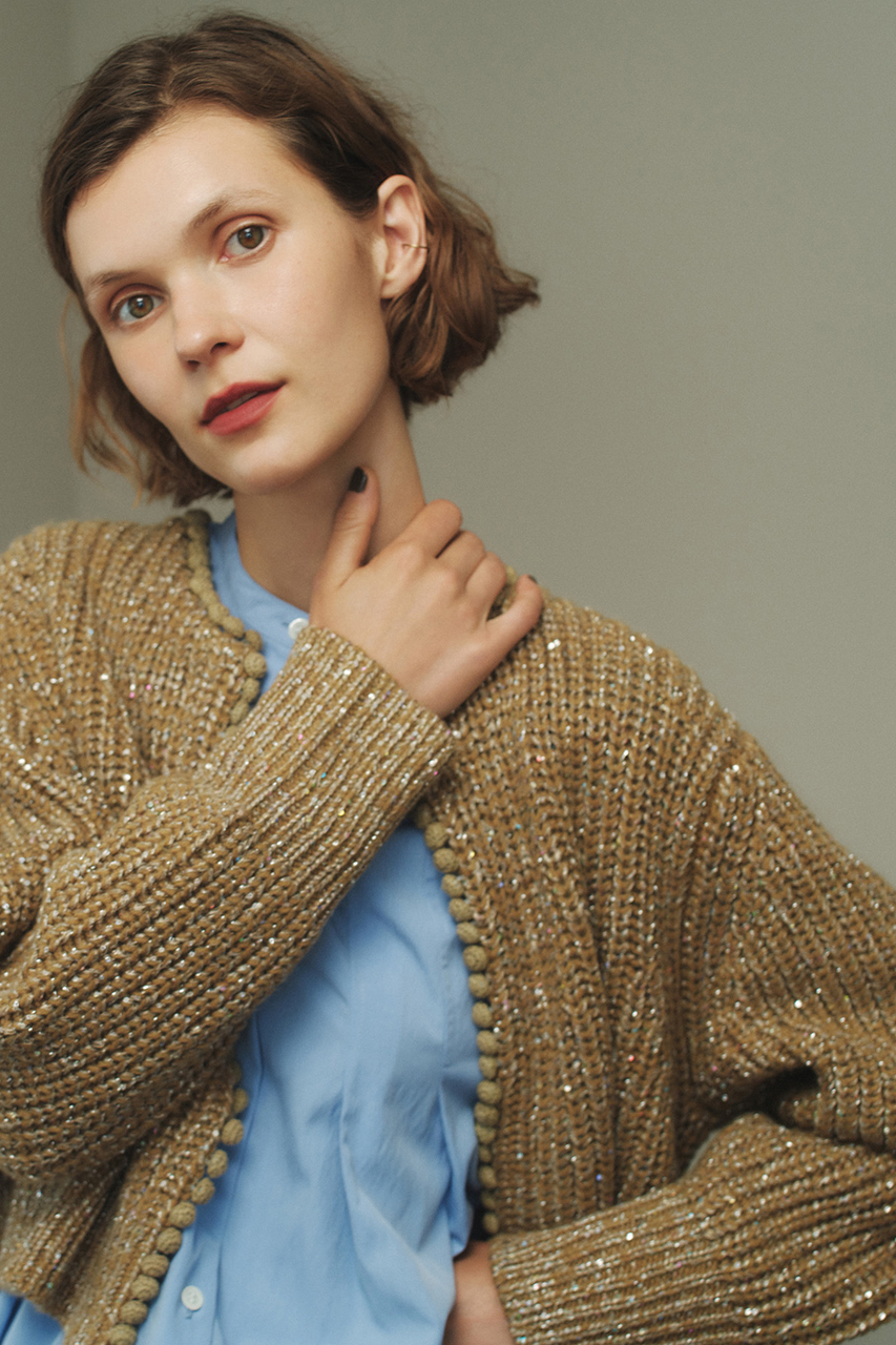 さりげなく光るスパンコールを散りばめたショート丈のボレロ風カーディガン。フロントのハンドクロシェットボタンがアクセサリー代わりの存在感。きれいめにもカジュアルにも幅広いコーディネートで活躍してくれます。