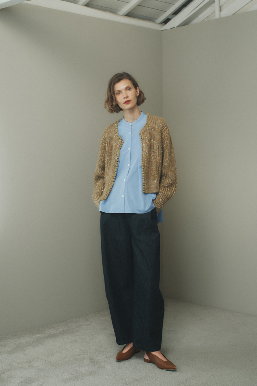 ウールコットンの糸にモヘアを絡ませた、柔らかな風合いのニットカーディガン。ボタンレスでラフに羽織るのが今の気分。袖口と裾にはバイカラーをきかせて、コーディネートにメリハリを。シンプルなワンツーコーデにほんのひとさじフェミニンさをプラスしてくれる存在。