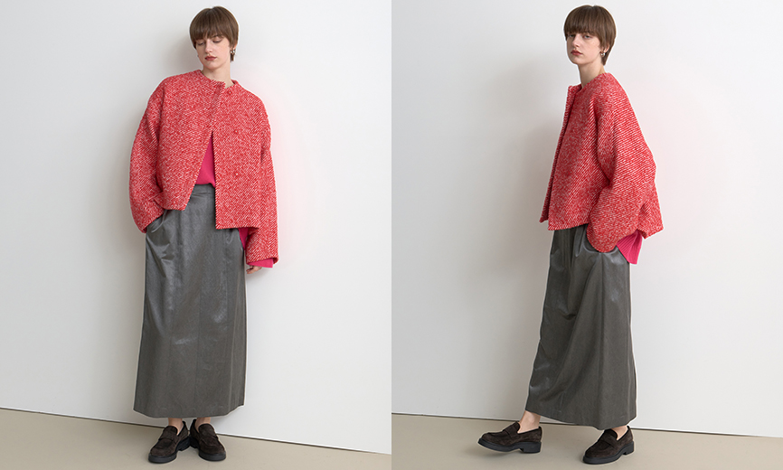 レッド×オフの霜降り調の織り生地があたたかみと華やぎを与えてくれるブルゾン。キュッと詰まった首とは対照的なスリーブ&バックの大胆なボリュームがクラシックとモダンの相反するイメージを演出。印象的なカラーのアウターもショート丈なら日常にも取り入れやすいので◎。