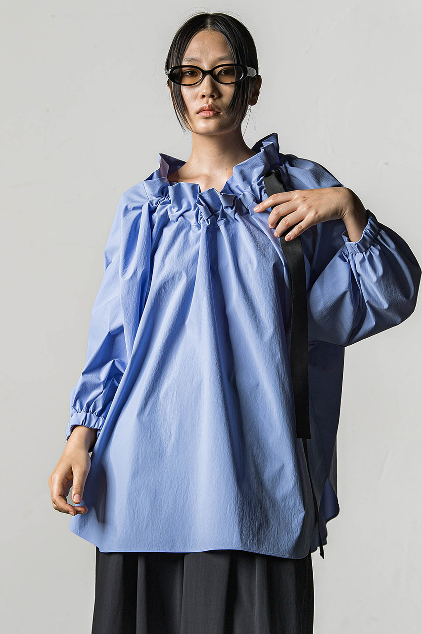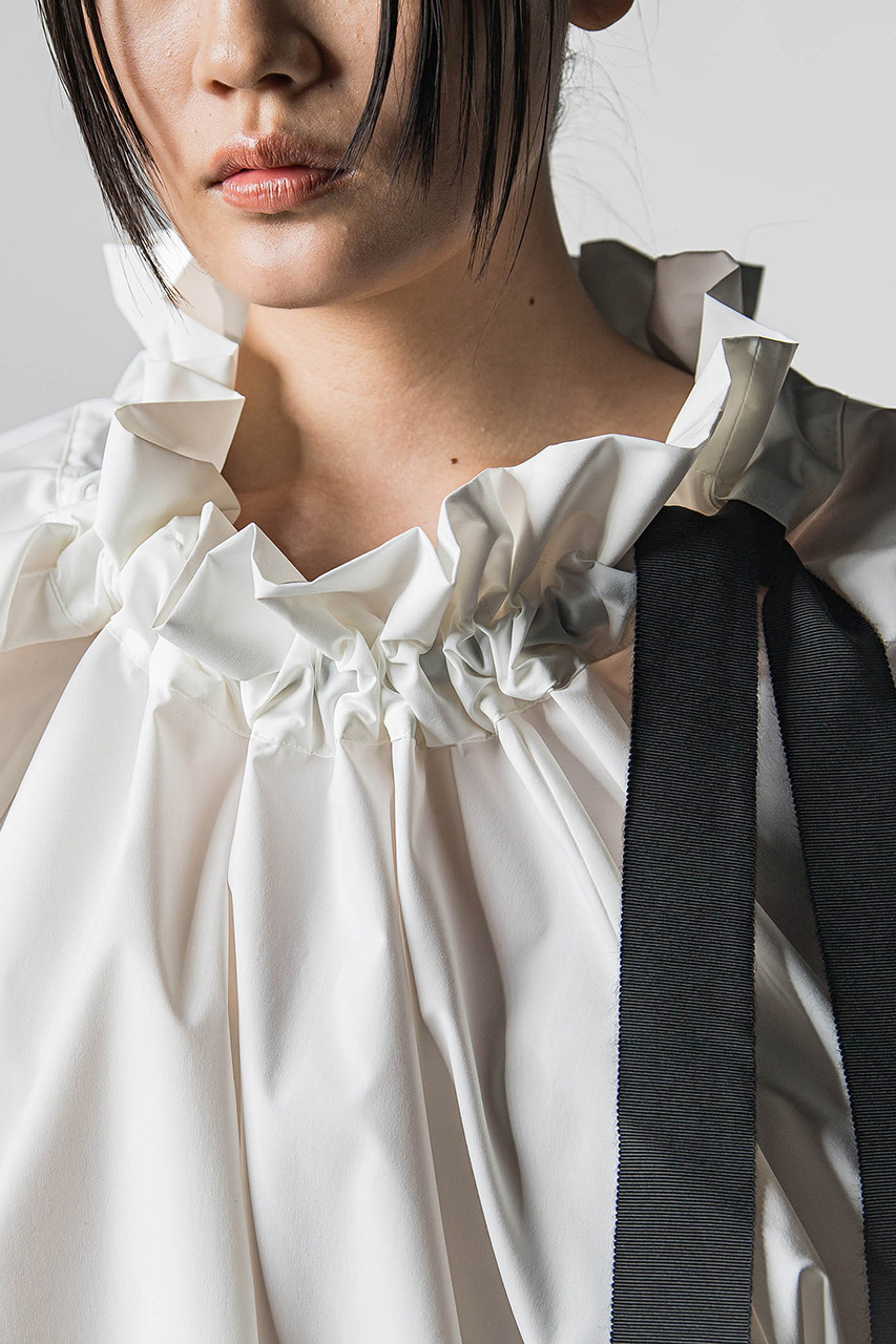 ネックのリボンをギュッと寄せる事で、顔周りのギャザーで華やかさを演出できます。