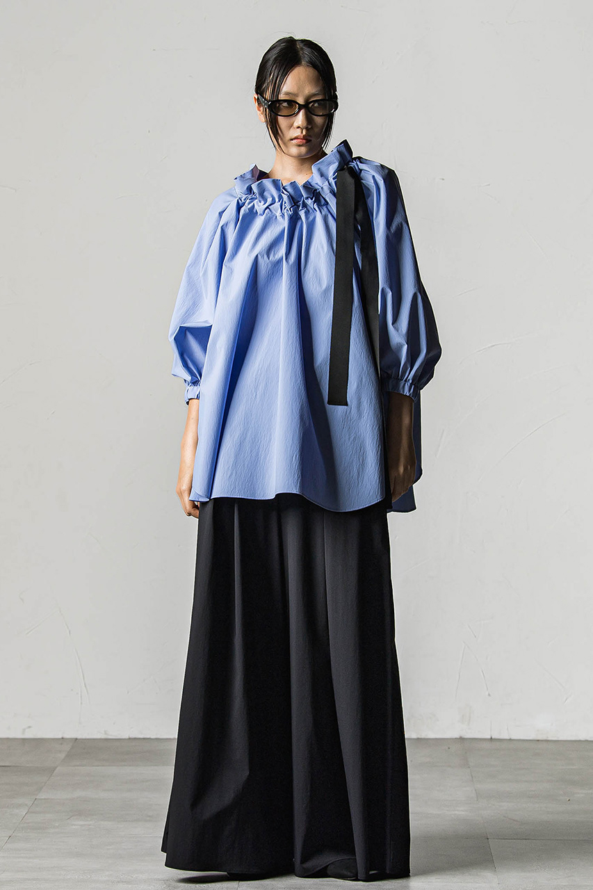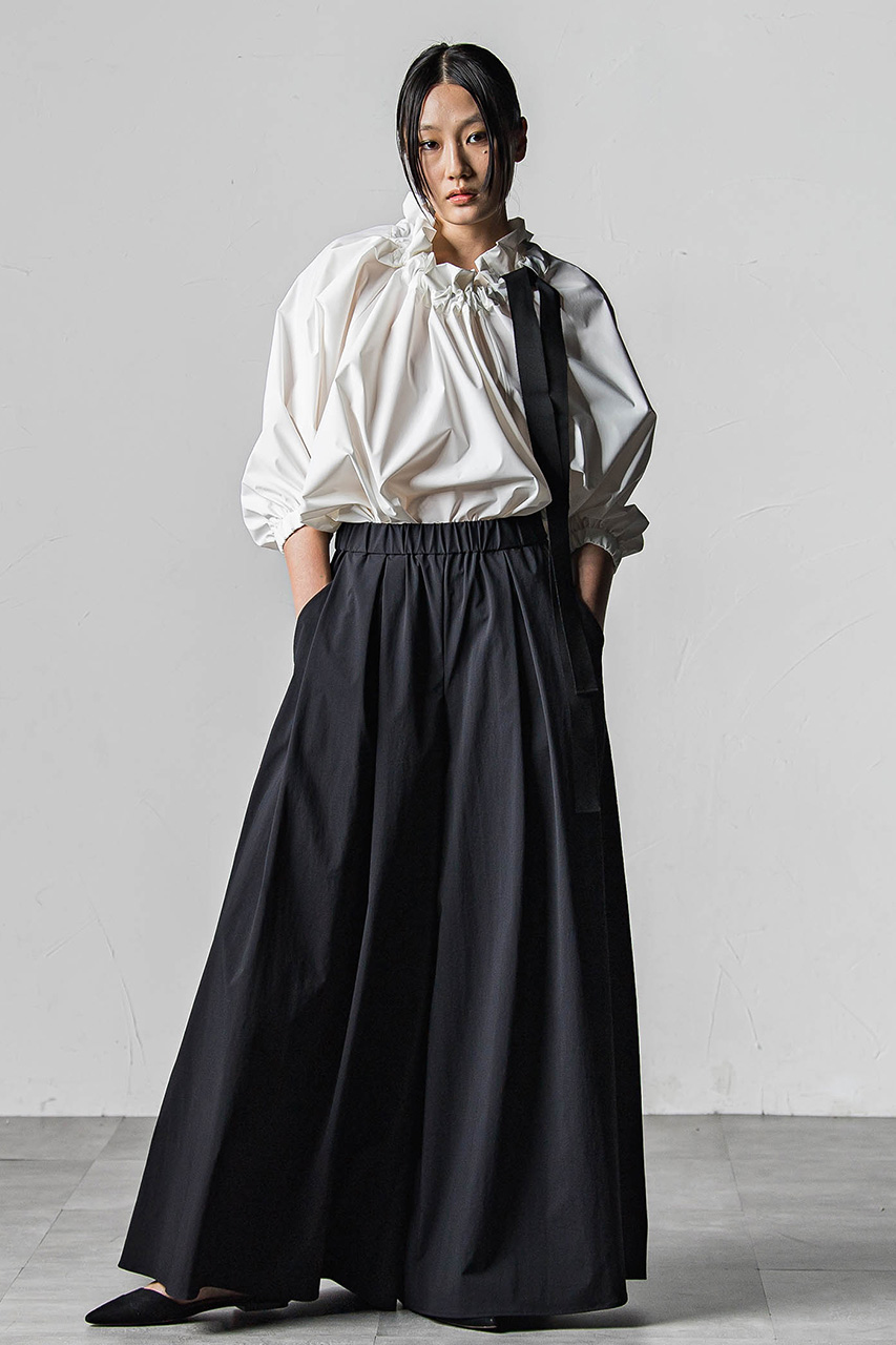 ボリュームスリーブのシャツをバランス良く着こなすには、 ハイウエストのパンツにインして。