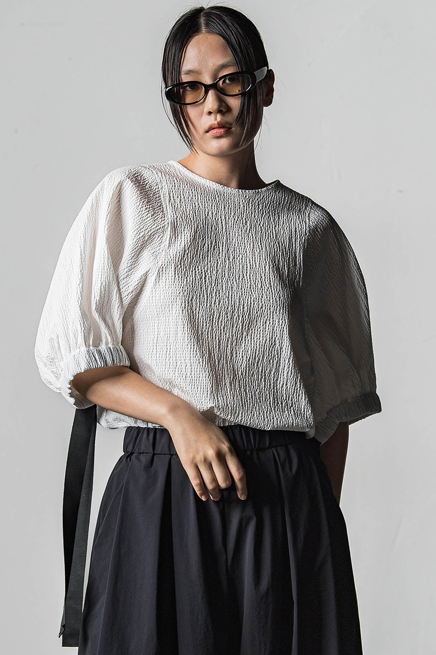 袖口に配色のリボンを通す事でギャザーを加え、立体感のあるフォルムに仕上げています。