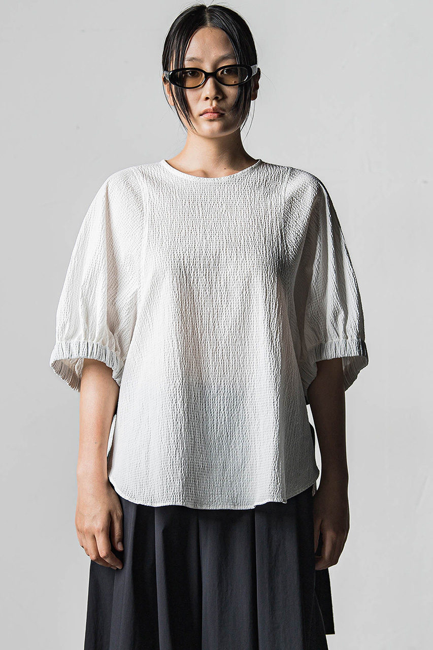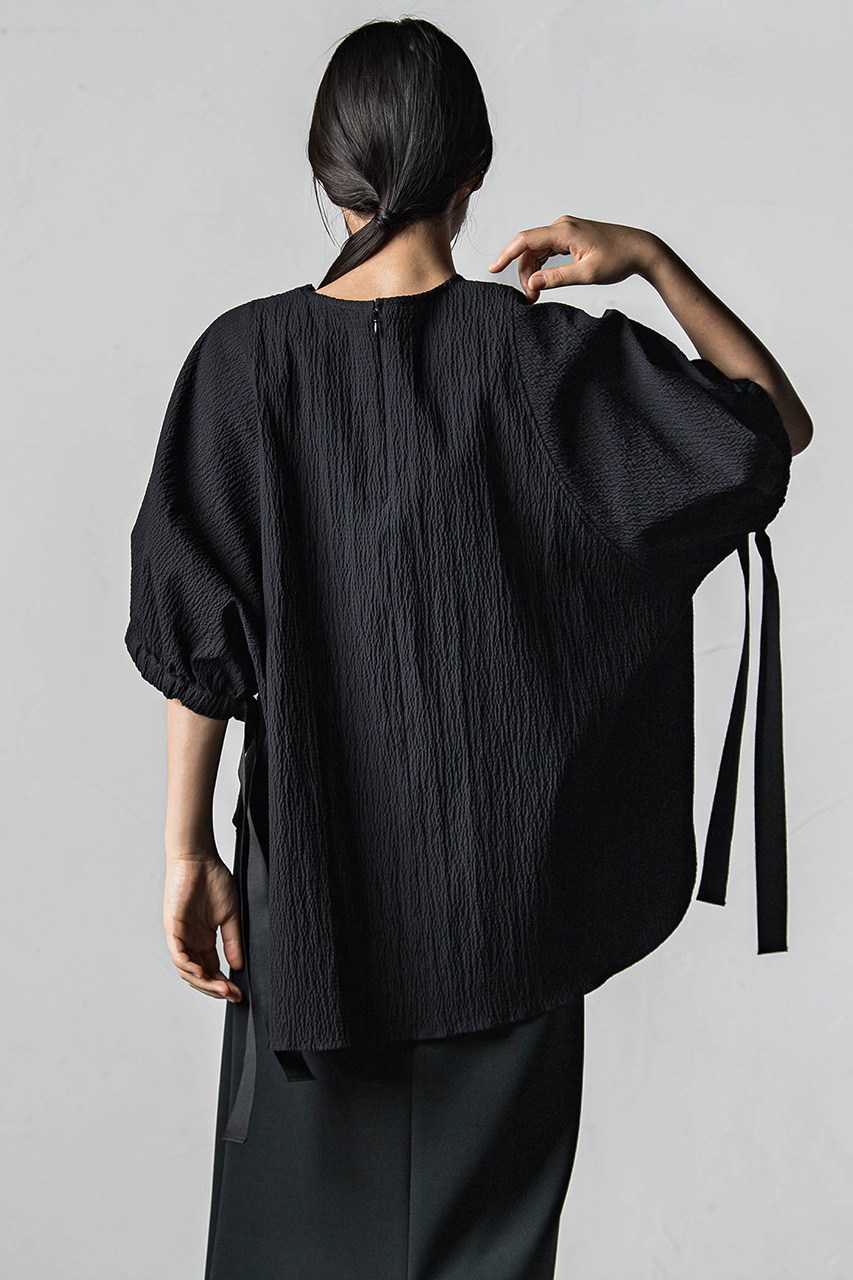 表情のあるマテリアルが華やかな印象のハーフスリーブブラウス。
