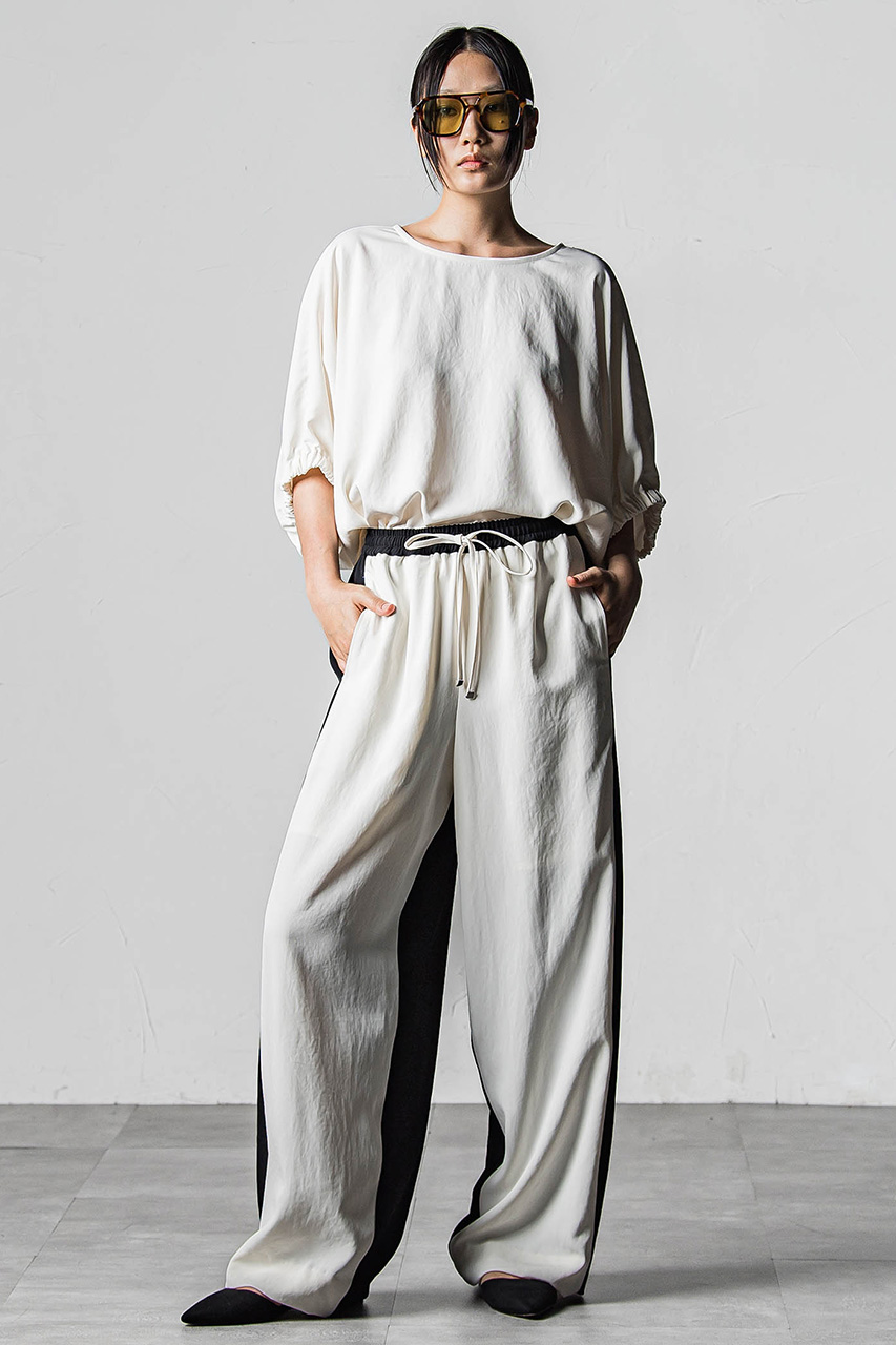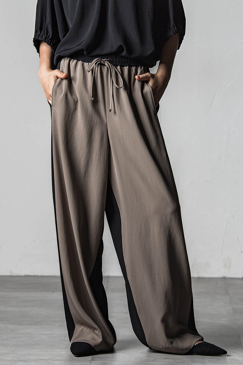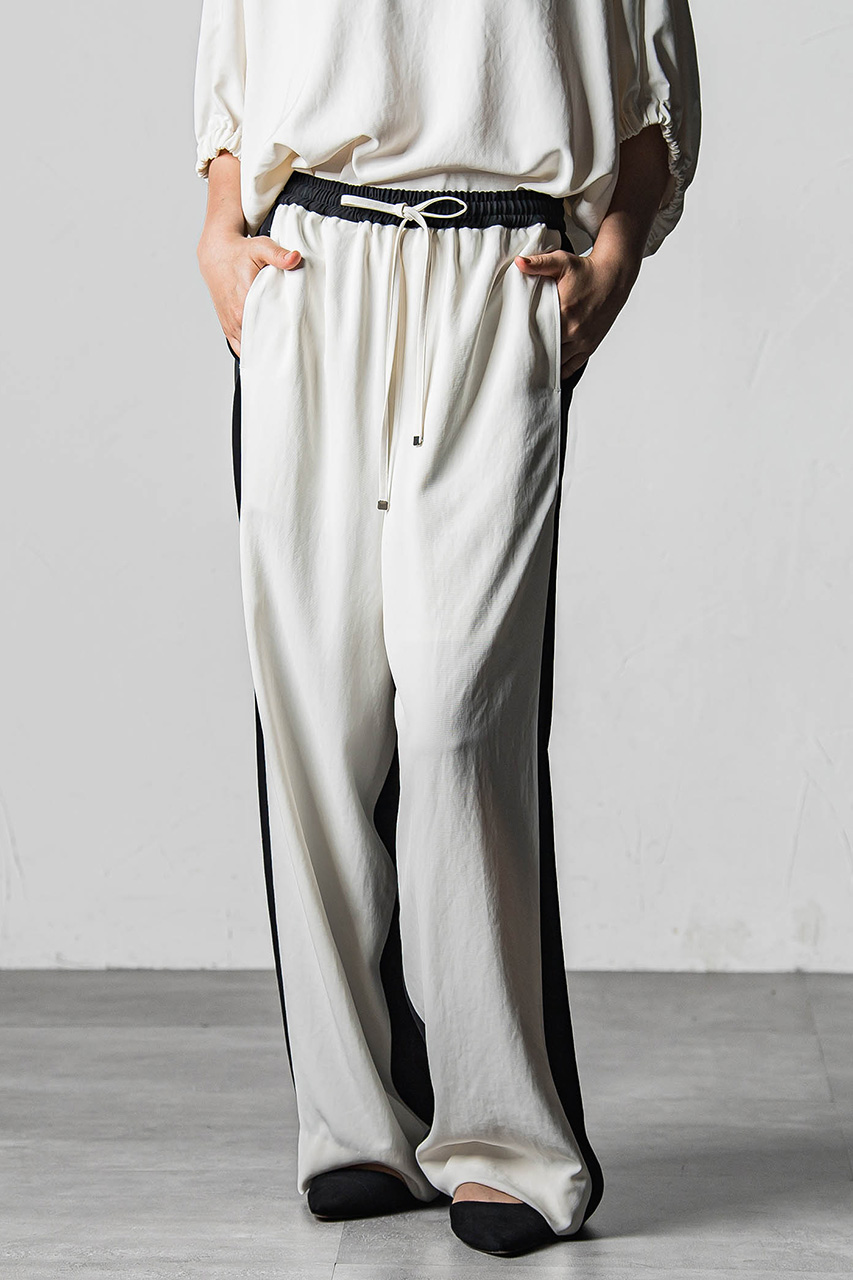 フロントとバックをバイカラーで切り替えた、スポーティムードのイージーパンツ。