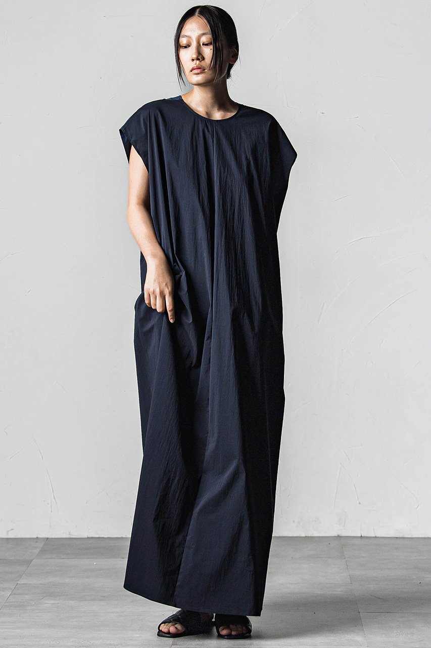 フロントとサイドをシームで切り替えたグラフィカルなサマードレス。ウエストにドローストリングでギャザーを加え、表情を付けました。Vネック、ラウンドネック2WAYで着用可能です。スレーブレスデザインながらも、袖周りをカバーしたカッティングのため、1枚でも尾着用頂けます。