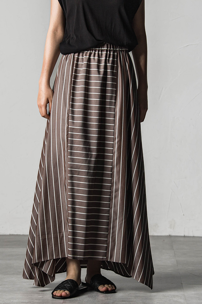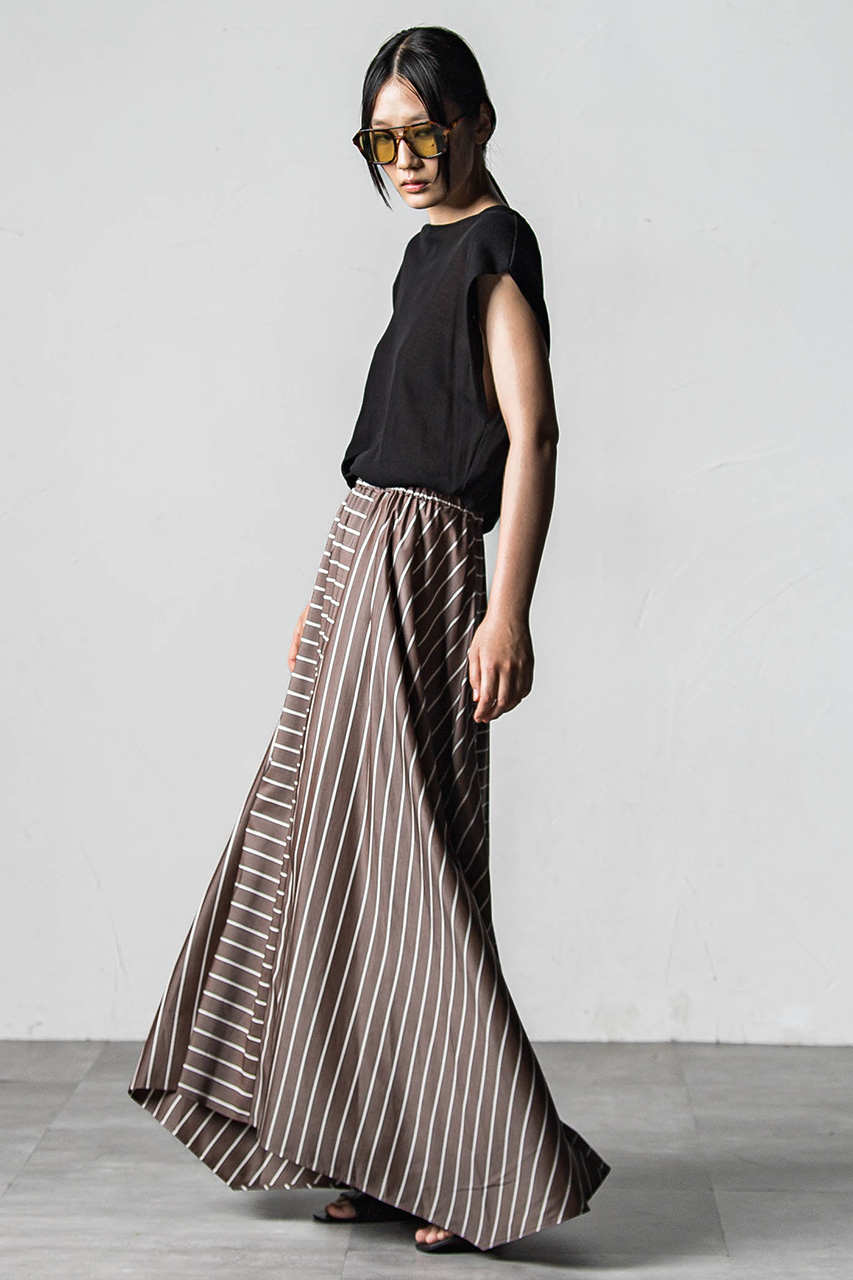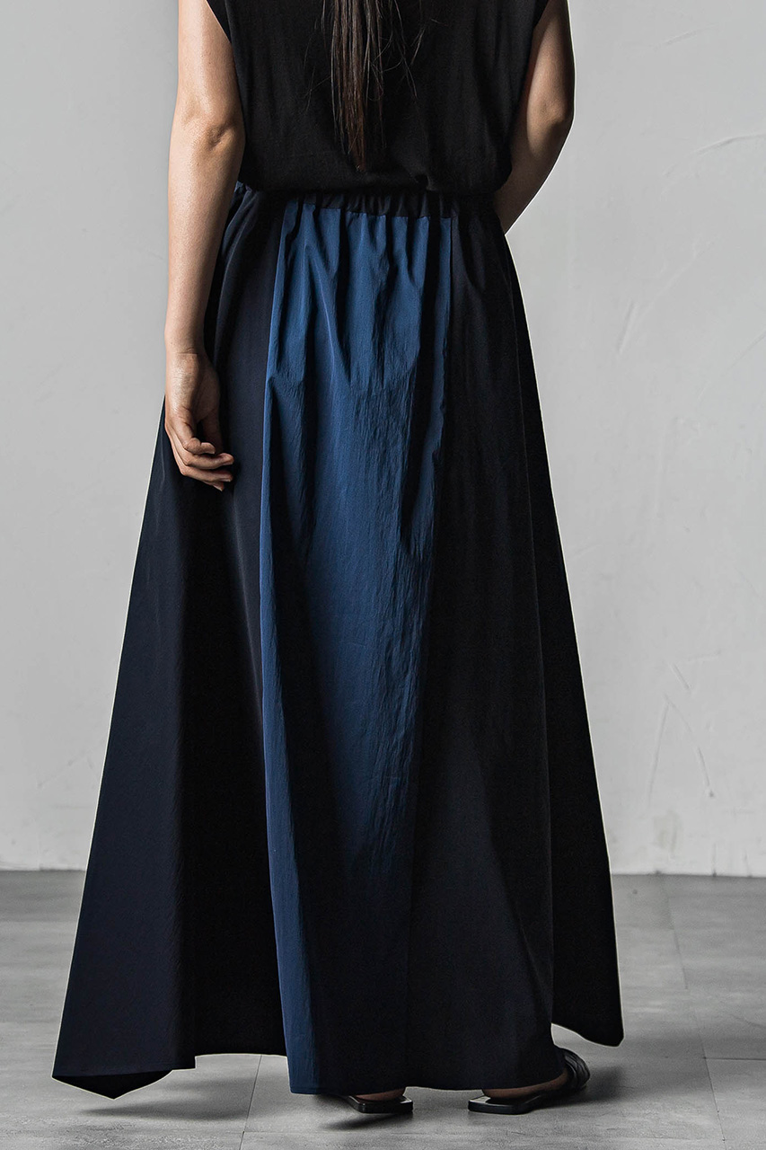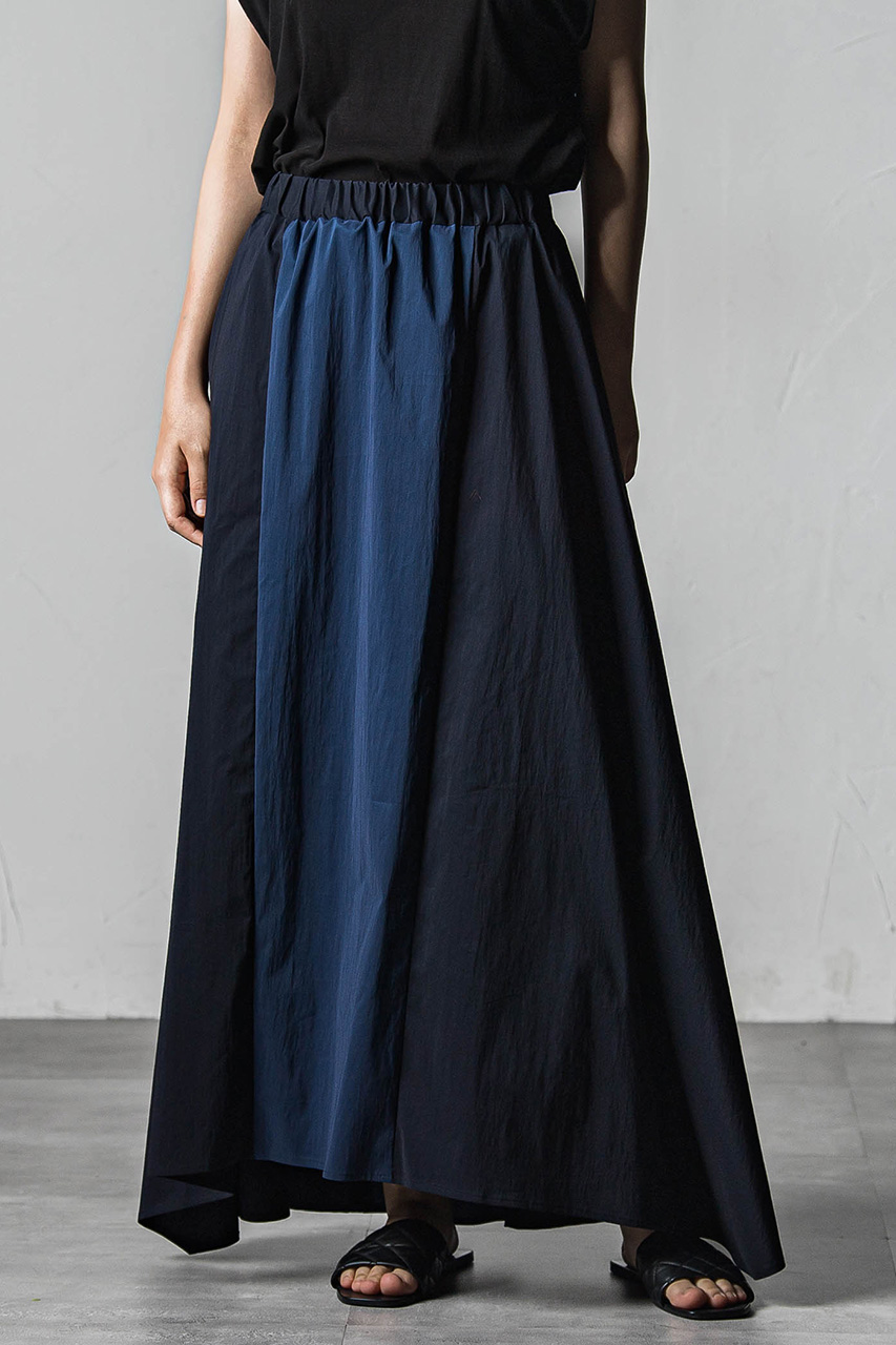 フロントとサイドをシームで切り替えたグラフィカルなフレアスカート。 オールゴムのウエストがコンフォータブルな着用感。サイドのパーツをトライアングルの形状にする事でモダンな印象に。