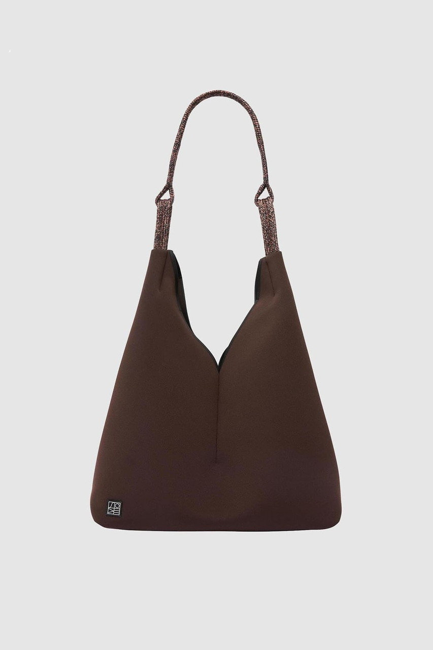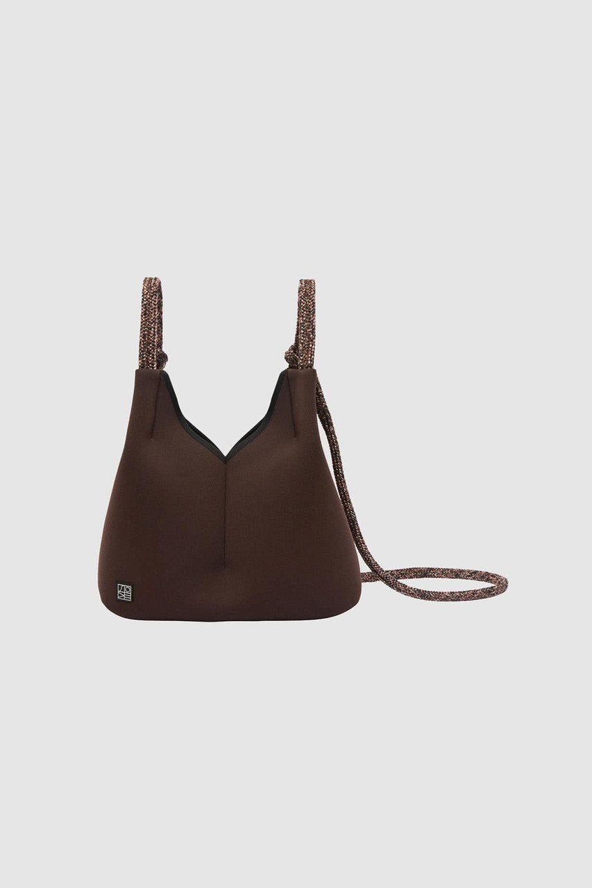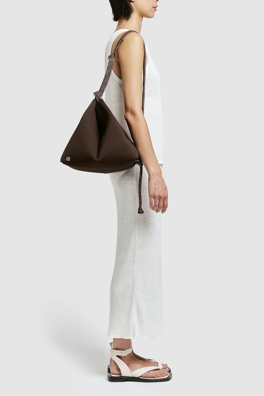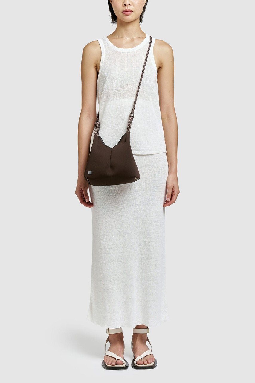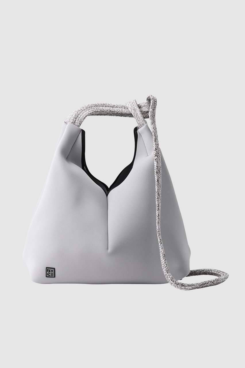“ソルスティス クロスボディ”は必要なものだけを携えて身軽に持てるミニマルデザイン。スマートフォンやミニ財布などの必需品を携えた軽やかなスタイルを叶えます。ロープをサイドに垂らしトップハンドルで手持ちすれば、より洗練された印象のスタイリングに。