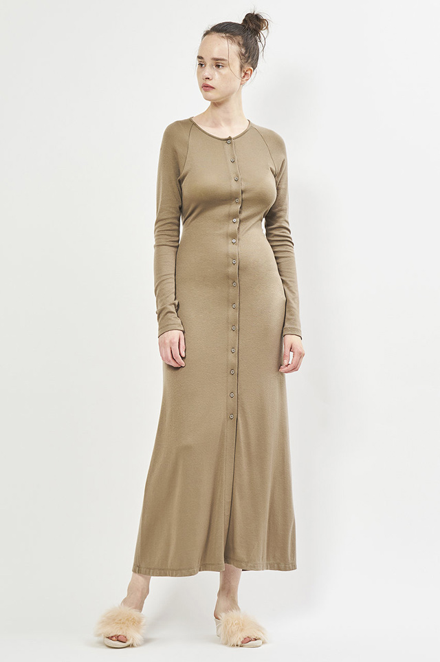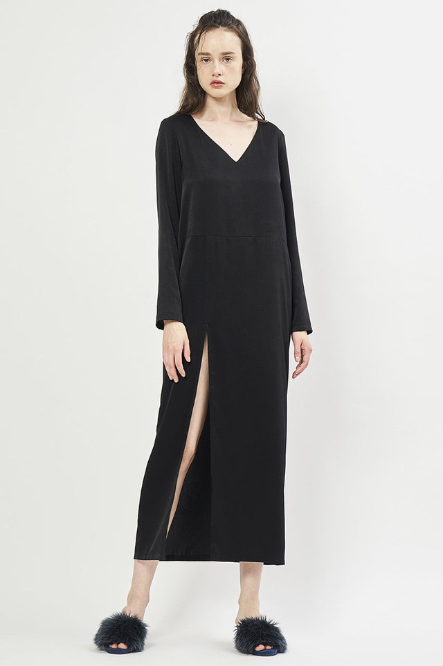ほんのり起毛感のあるスエード調の風合いが高級感を醸し出す上品なVネックロングワンピース。フロント右サイドに入った深いスリットがポイントに。透け感のある軽やかな素材感だから幅広いシーズンに◎。シンプルなデザインで合わせるものを選ばないからデイリーユースに大活躍してくれそう。