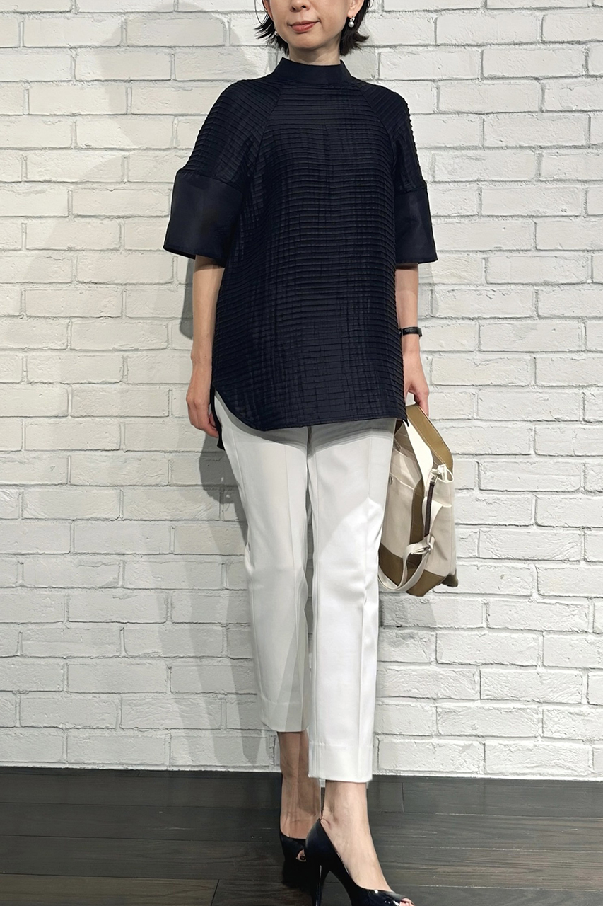 合わせたトップスは、現在展開中の「ラミーピンタック コクーンスリーブ ブラウス」。ふんわりとした袖の立体感がコーディネートに華やぎをプラスしてくれます。