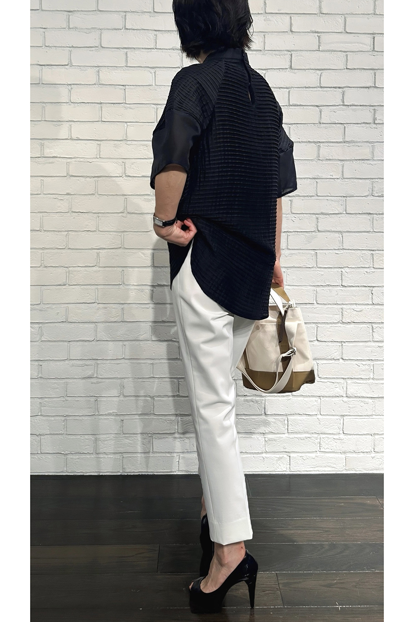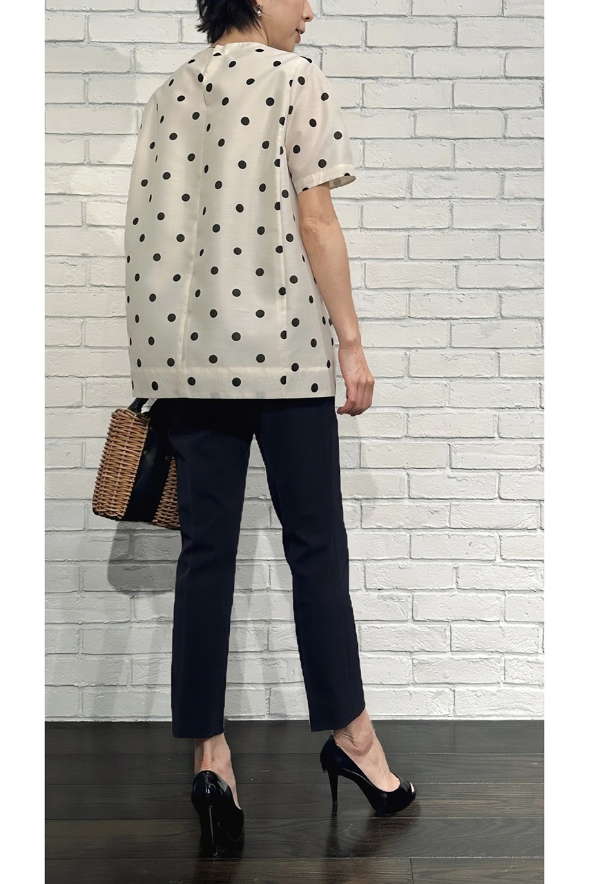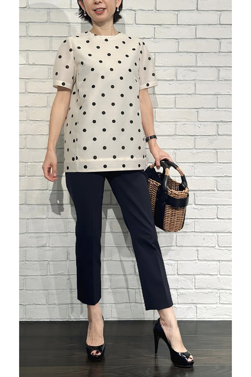 合わせたトップスは、ただいま展開中の「ドットオーガンジー フォルムブラウス」。ほんのり甘さのあるデザインが、いつものパンツスタイルに華やぎを添えてくれます。