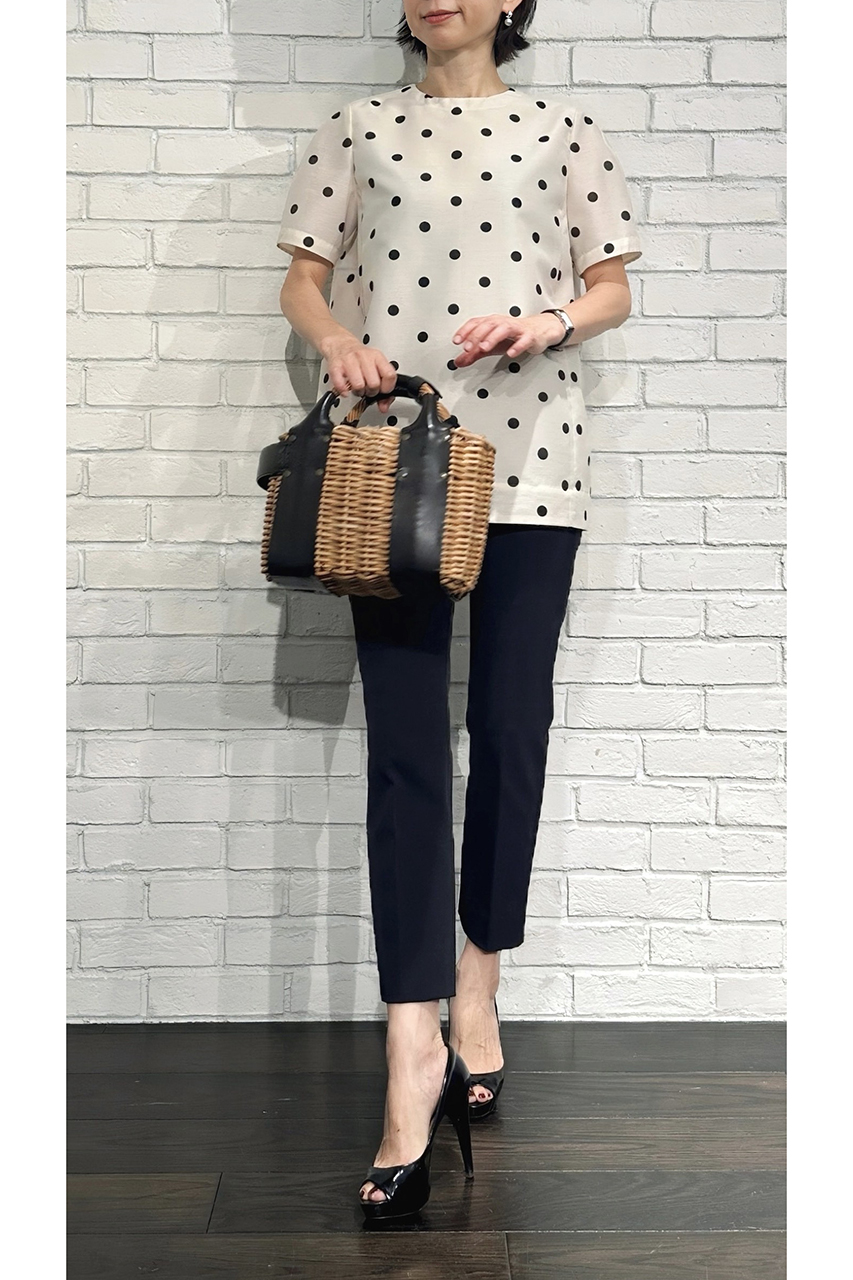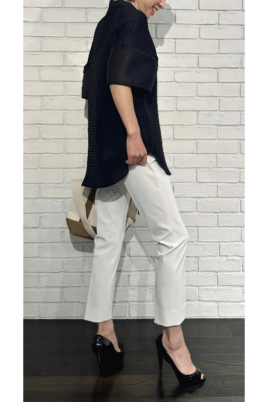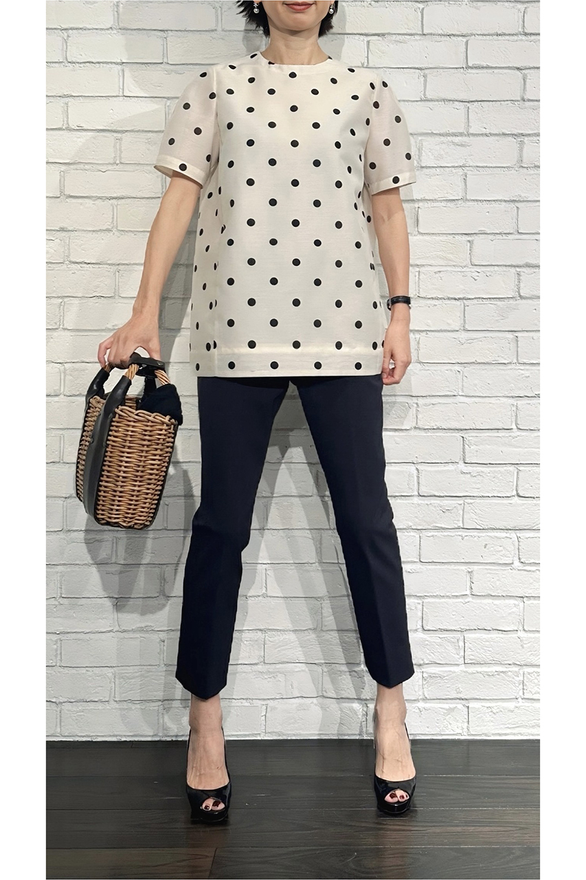 合わせたトップスは、ただいま展開中の「ドットオーガンジー フォルムブラウス」。ほんのり甘さのあるデザインが、いつものパンツスタイルに華やぎを添えてくれます。