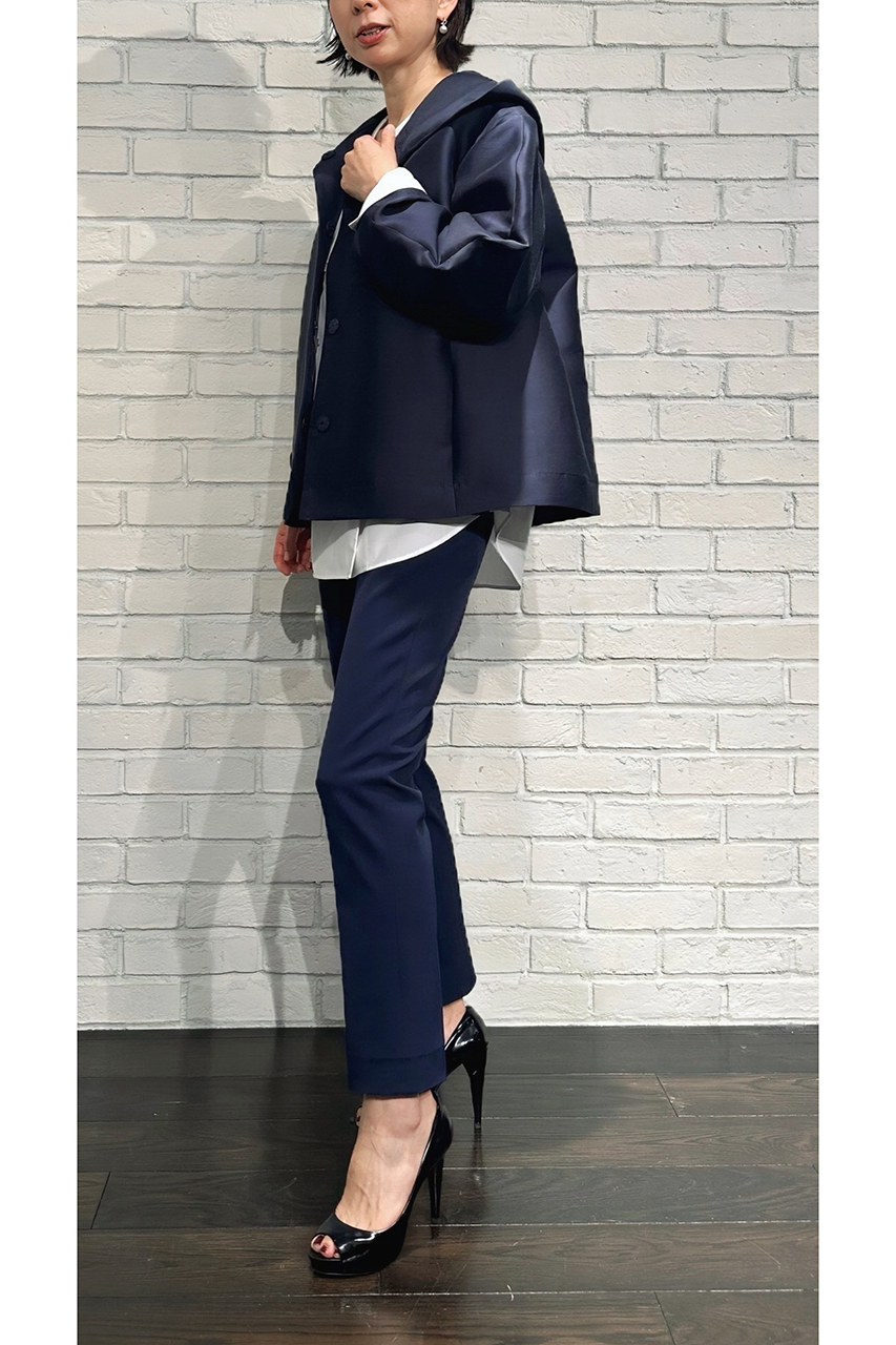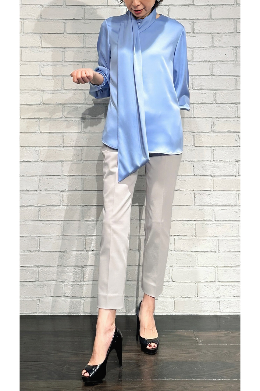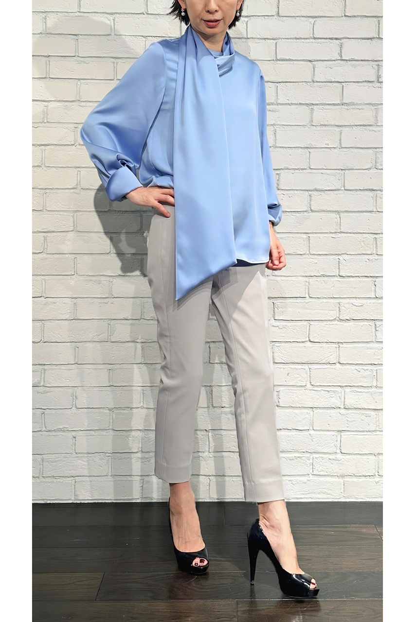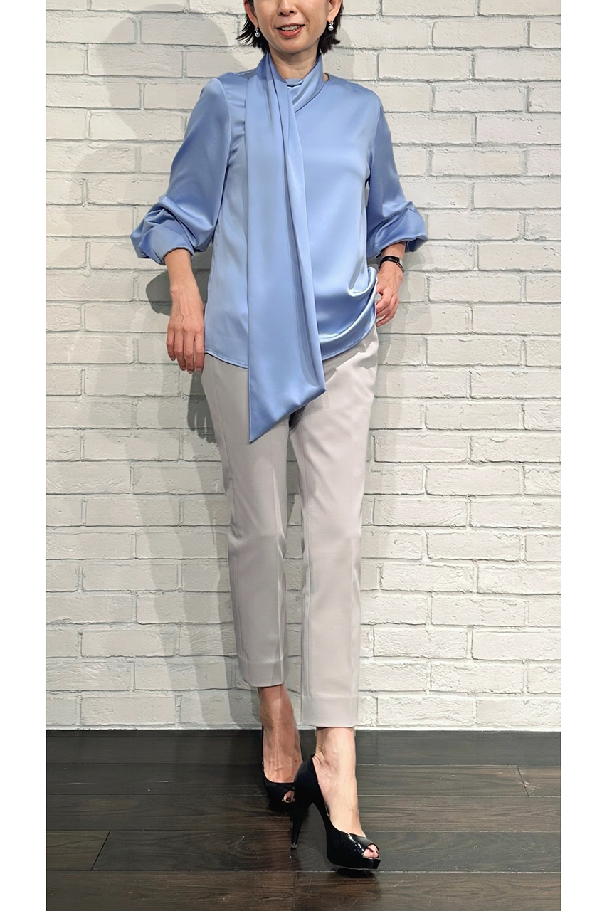 合わせたトップスは、8月入荷予定の「ハンマーサテンアシンメトリーボウタイブラウス(252-15951)」。滑らかな光沢感とアシンメトリーなデザインが、大人の着こなしにひとさじの華やかさを添えてくれます。
