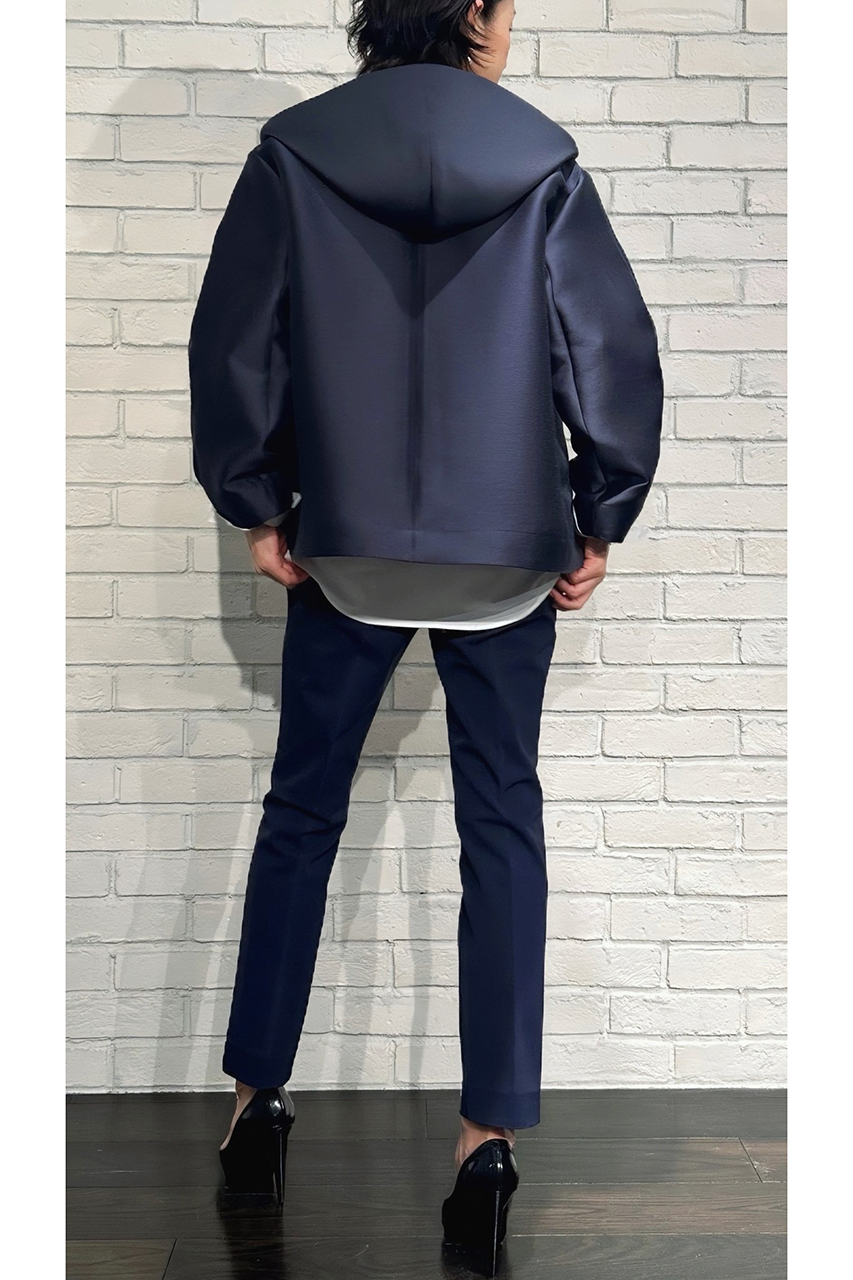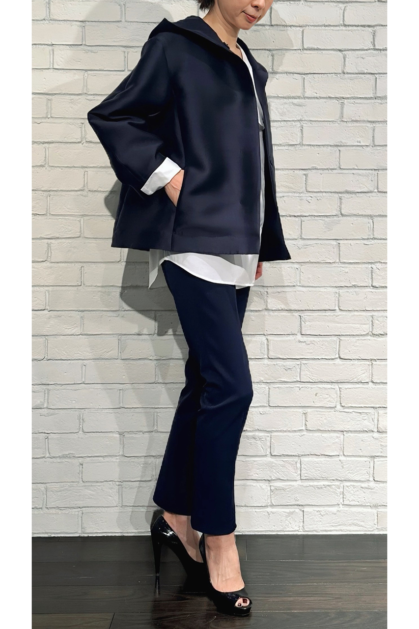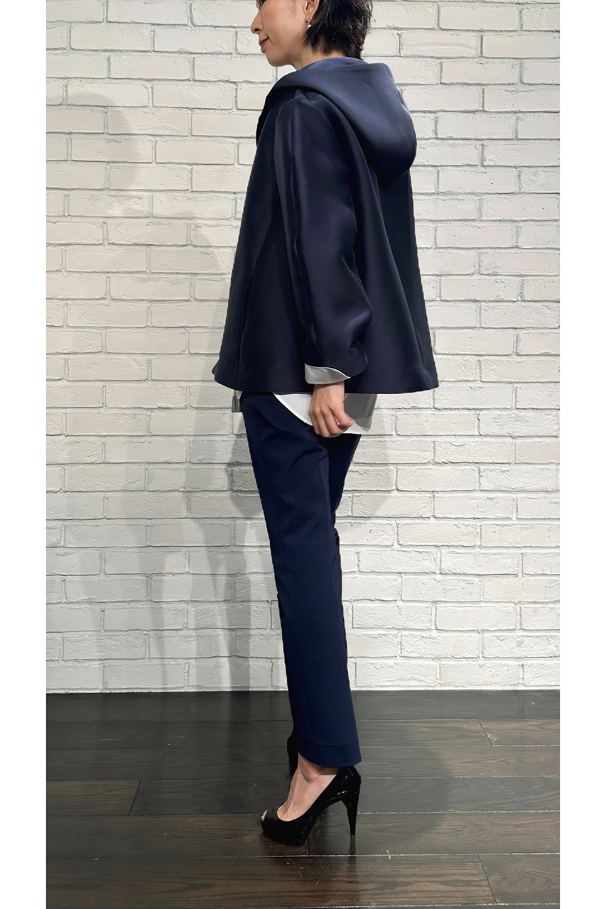 合わせたトップスは、8月入荷予定の「シルキーWクロスフード付きパーカー(品番:252-11388)」。なめらかな素材感とフードの立体感が、大人カジュアルにこなれた印象を添えてくれます。