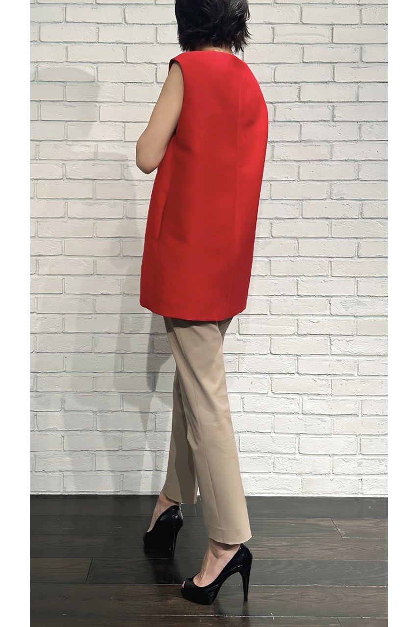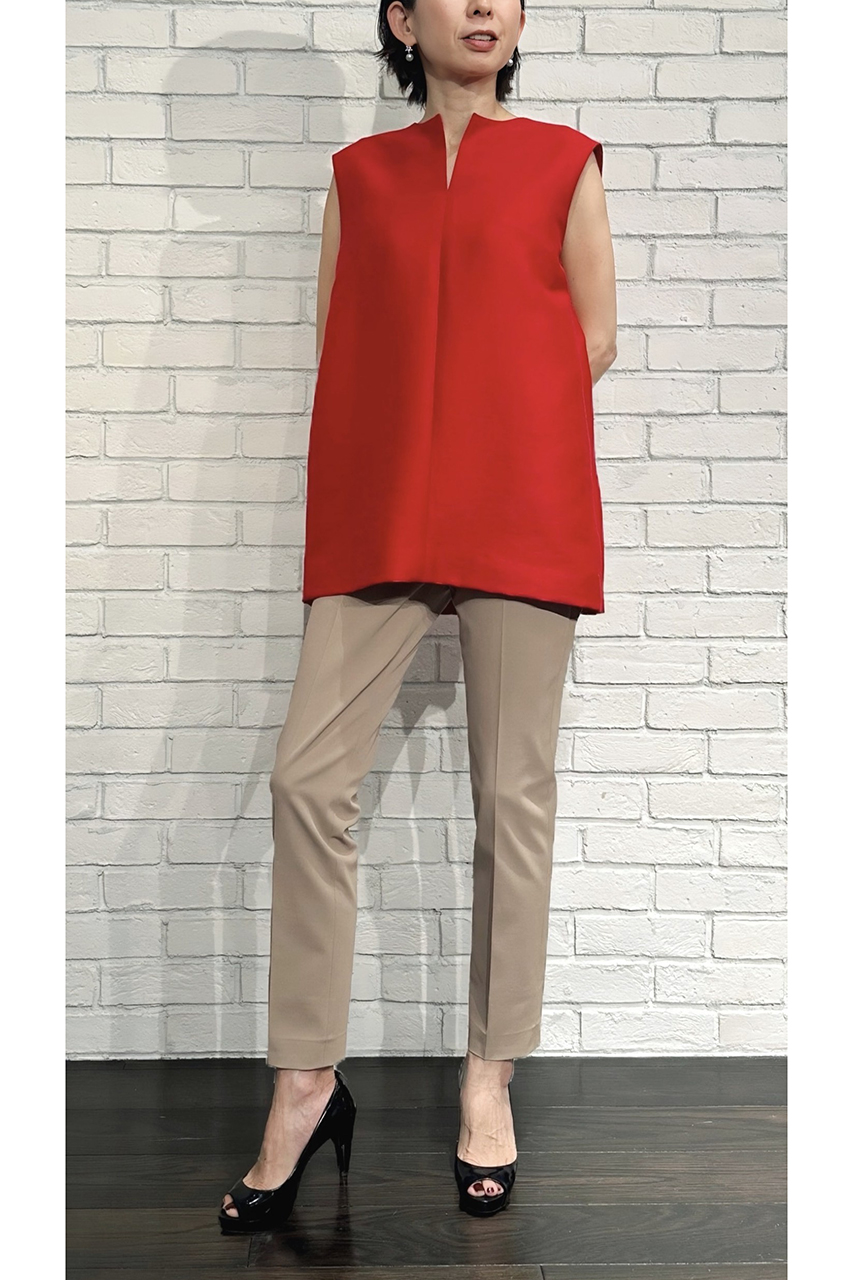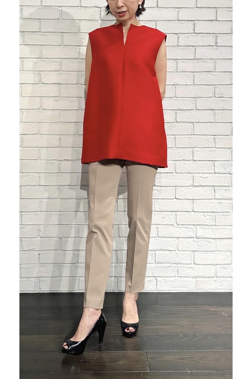 合わせたトップスは、7月入荷予定の「バブリーダブルクロスキーネックジレ(252-19079)」。軽やかに羽織れるジレは、夏のレイヤードスタイルにもぴったりです。