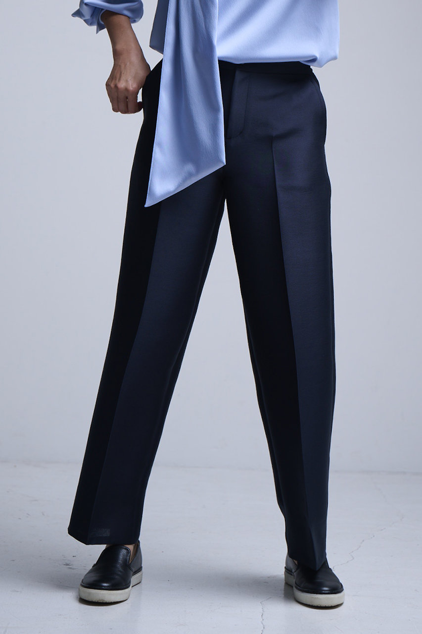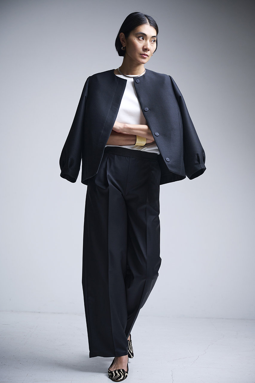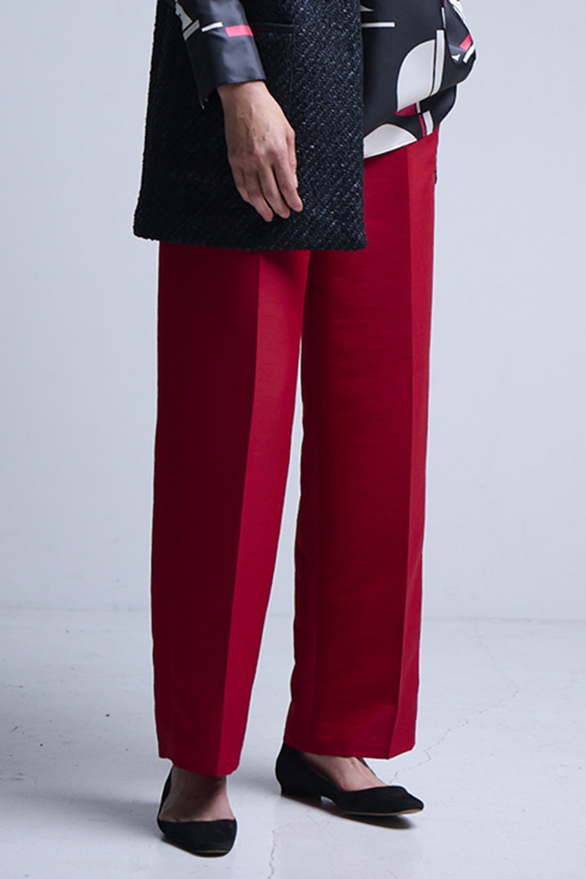ラフに着用できてきれいめな大人コーデが叶う、頼れるワイドパンツ。適度な厚みと光沢のあるダブルクロスが上品で、センタープレスがよりきちんと感をキープ。腰まわりに余裕のあるテーパードシルエットが動きやすさと洗練ムードを両立。オフィスからオケージョンまで外せない1本になりそう。 コーディネートのワンポイントとして、トレンドのレッドもおすすめ。
