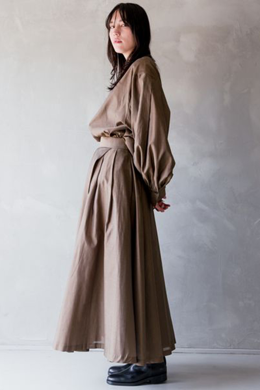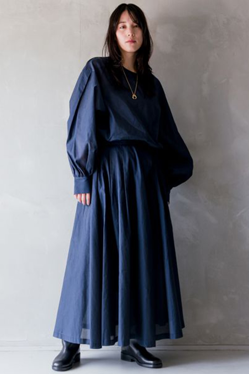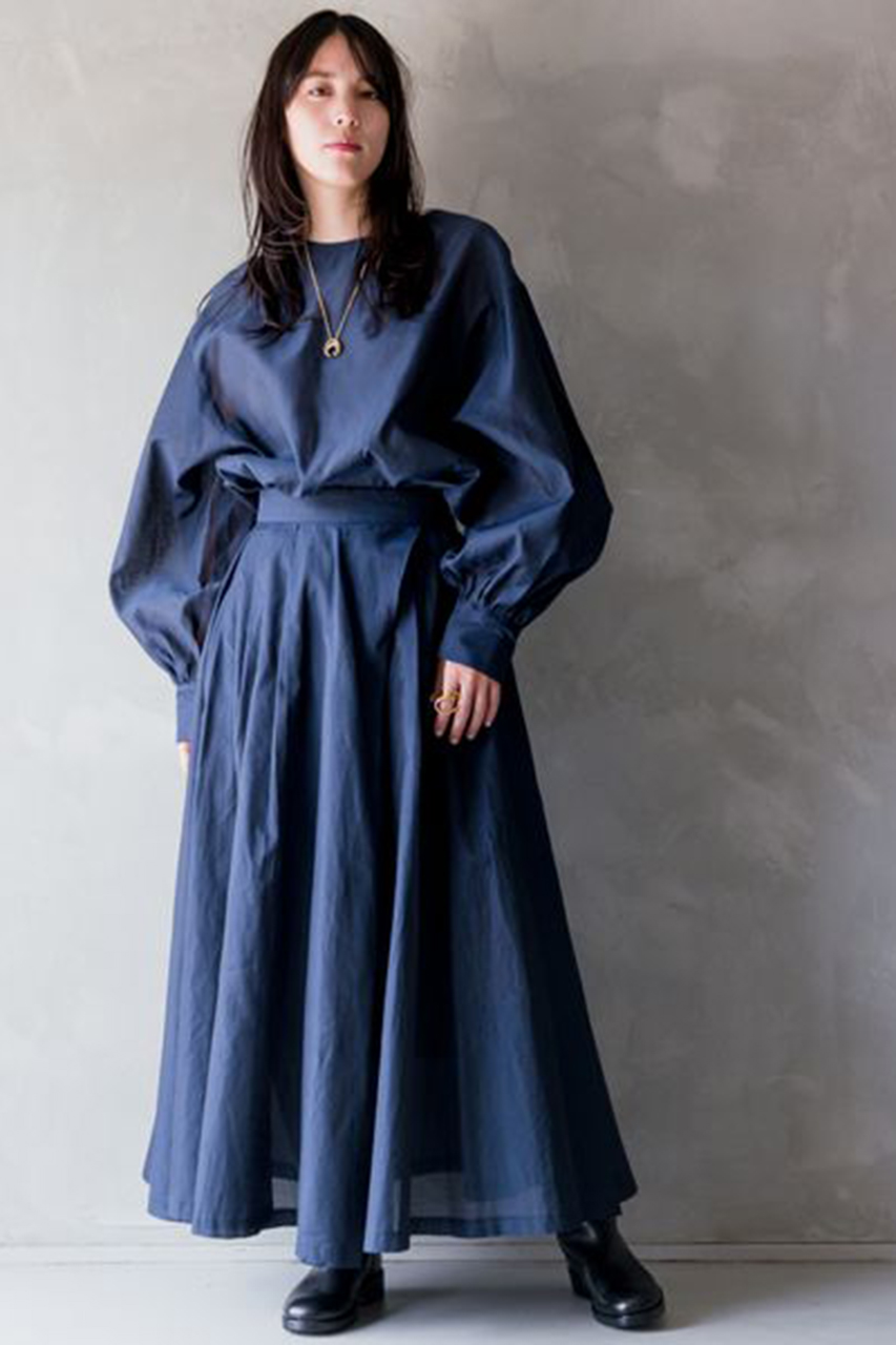 立体的なフォルムが魅力的なブラウスとドレープの流れ方にこだわった女性らしいシルエットのスカートは、どちらも「カオス」ならではのこだわりぬいた他にはないデザイン。セットアップで合わせるとグッとエレガントな雰囲気になります。