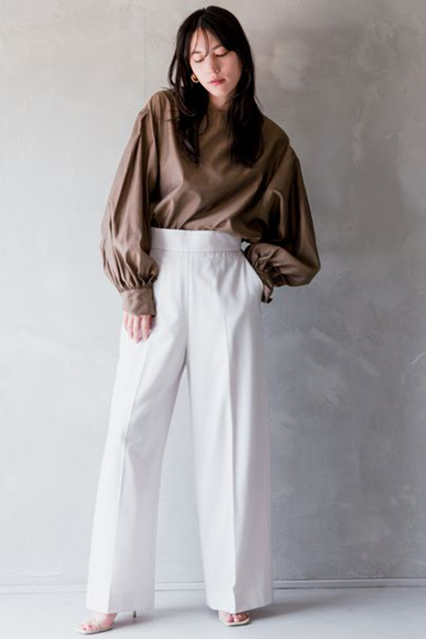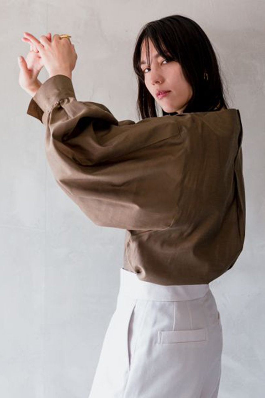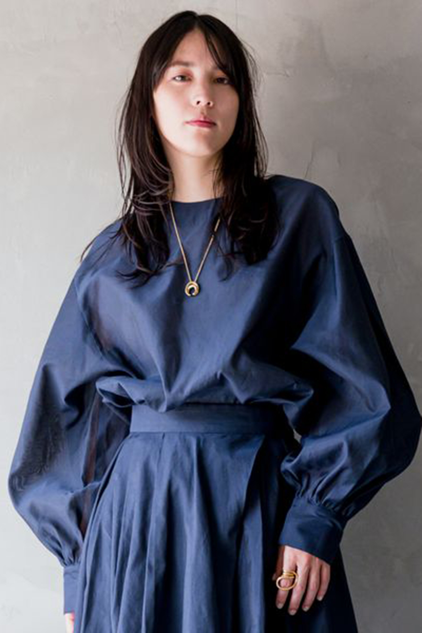 立体的なフォルムが魅力的なブラウスとドレープの流れ方にこだわった女性らしいシルエットのスカートは、どちらも「カオス」ならではのこだわりぬいた他にはないデザイン。セットアップで合わせるとグッとエレガントな雰囲気になります。