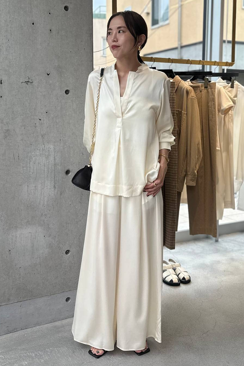 シルクコンシリーズの初代のフレアパンツより、股上が深くややゆとりのあるシルエットです。
