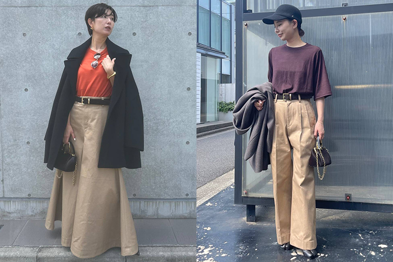 ウエスト、ヒップ周りはフィットしていますが、裾に向けドラマチックにフレアを感じることが出来るロングスカートと、Chaosのドレス系トラウザースをベースに作成したきれいめな印象のチノパンツ。