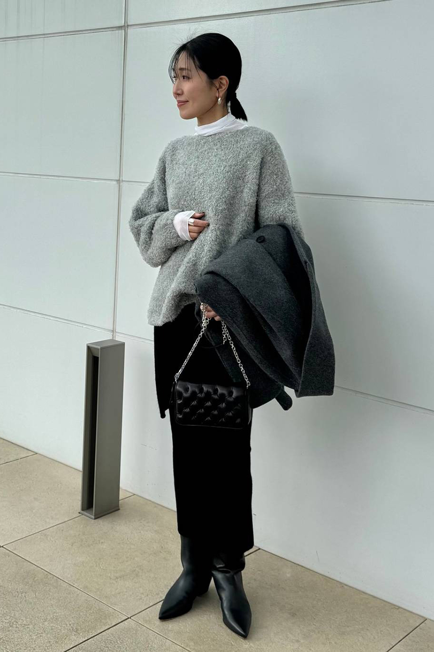 オーバーサイズのタートルネック。長めの着丈でバランスも取りやすいです。
