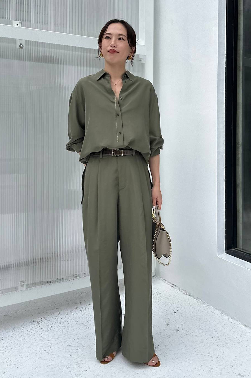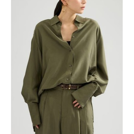 抜け感と余裕を感じさせるオーバーサイズシャツで、シルク特有の上品な光沢と落ち感が、女性らしい縦のラインを美しく見せてくれます。