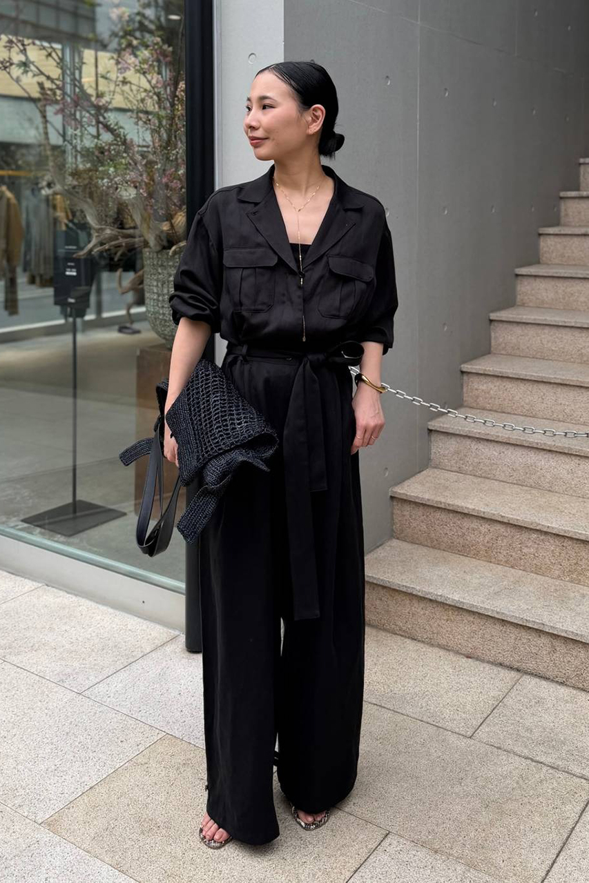 ミリタリーの無骨さとサテンの艶やかさが共存する都会的なオールインワン。