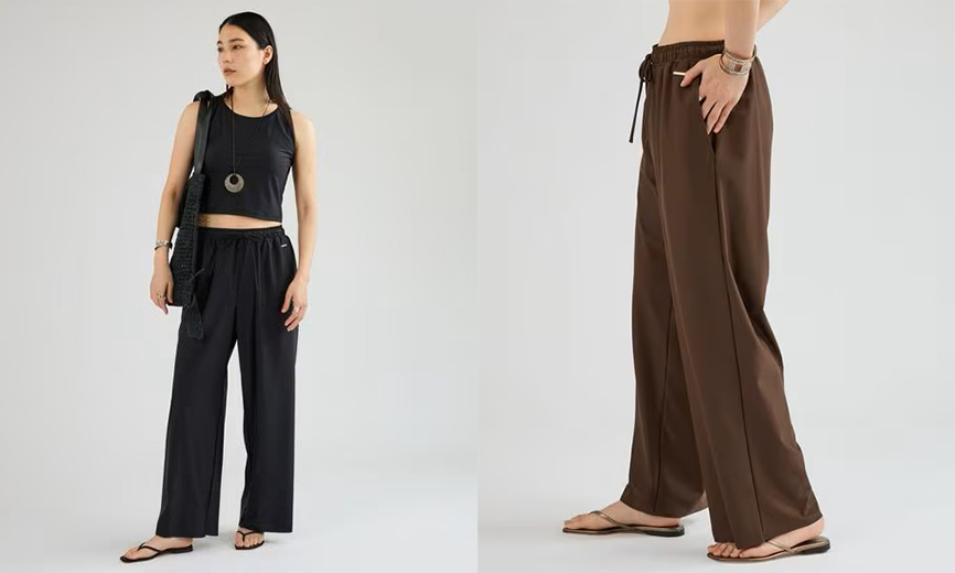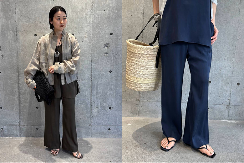 ウエストゴムのリラックスした履き心地ながら、セットアップでの着こなしはラグジュアリー感もあります。