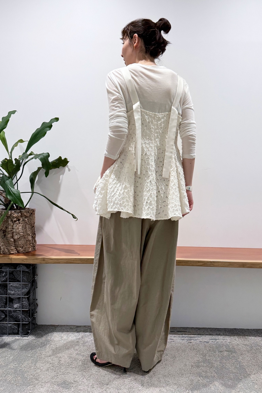 フェミニンなブラウスなため、あえて落ち感のあるルーズなパンツと合わせてハンサムさをプラスしたスタイリングに。