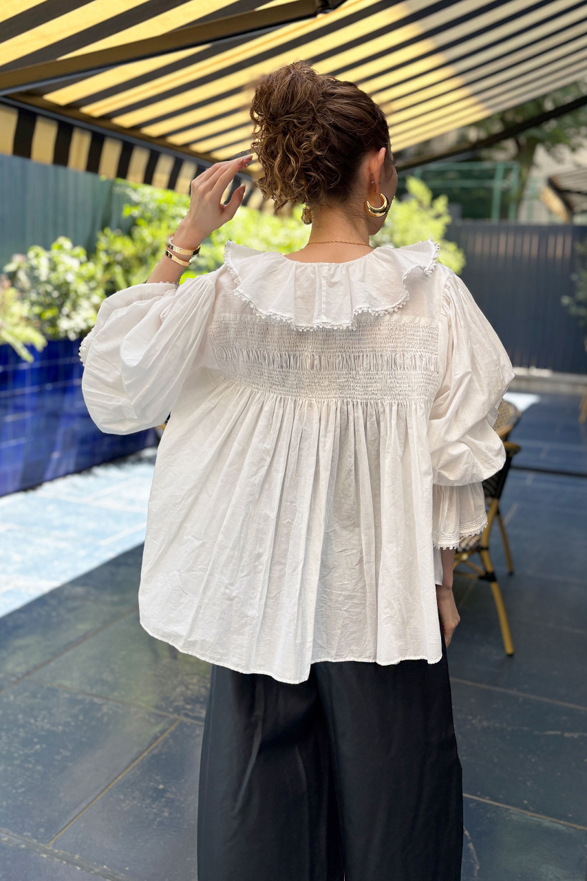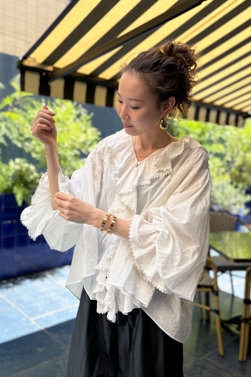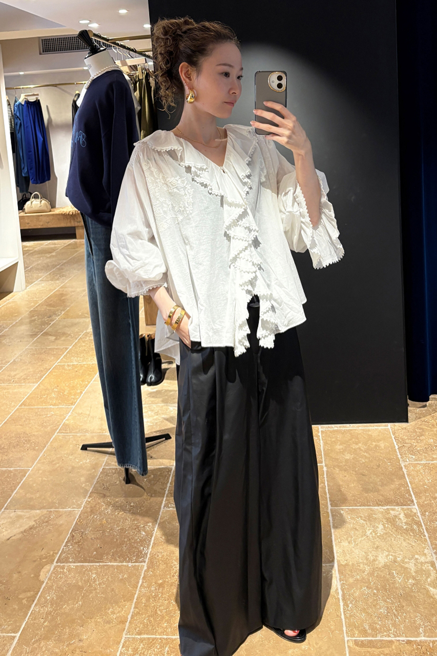 フリルとシャーリングギャザーをふんだんに取り入れ、オリジナル刺繍も施したカレンソロジーらしさのつまった贅沢なブラウス。華やかなフリルのディティールが心くすぐるデザインです。肌触りのよい薄手のコットン素材で今から秋まで活躍します。フロントのボタン次第で、トップスとしても羽織りとしても着用可能なのも嬉しいポイント。今回はレザーパンツと合わせて大人女性にぴったりな甘辛なスタイリングに♪
