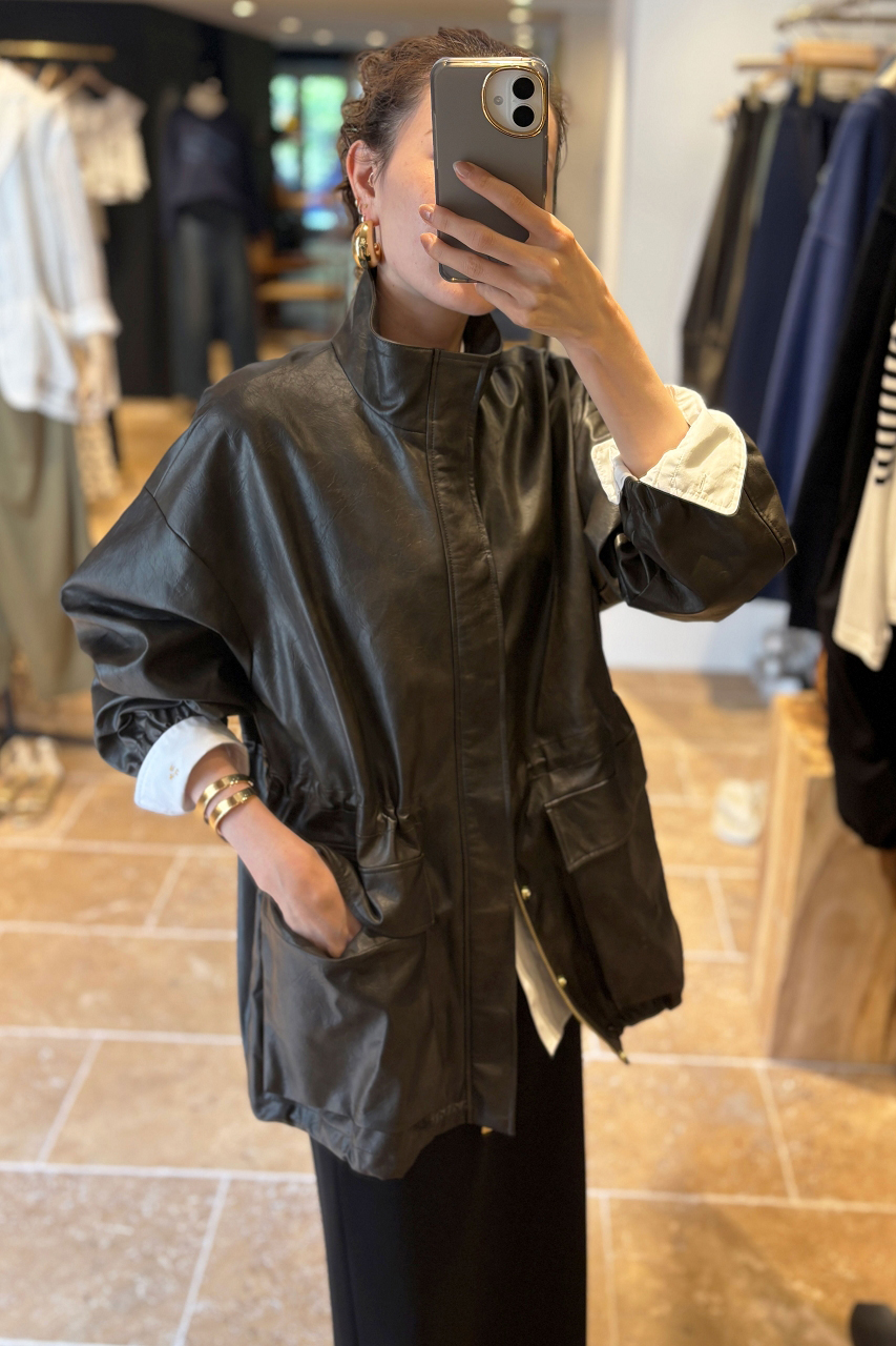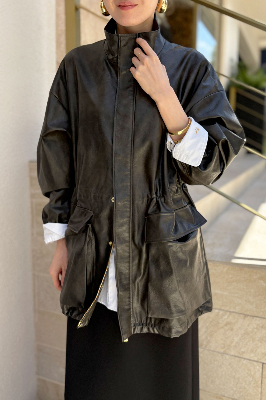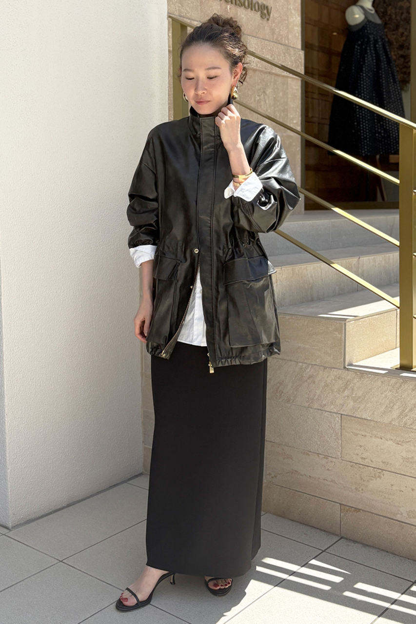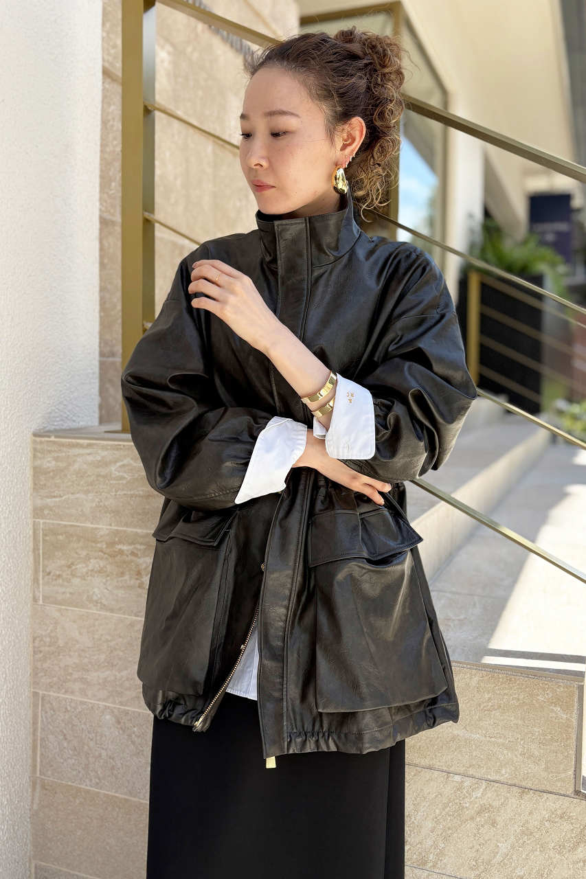 ハンサムなシルエットで高級感漂うフェイクレザーブルゾンが8月入荷♪メンズライクな印象のブルゾンですが、あえてタイトスカートと合わせてクールで女性らしいスタイリングに。ヴィンテージ調のナチュラルなシワ感と、しっとりと柔らかい風合いが魅力的。防寒性があり、寒い日や雨の日でも快適に着用可能なのがおすすめポイントです。ウエストが絞れるため、お好みのシルエットで着こなせます。