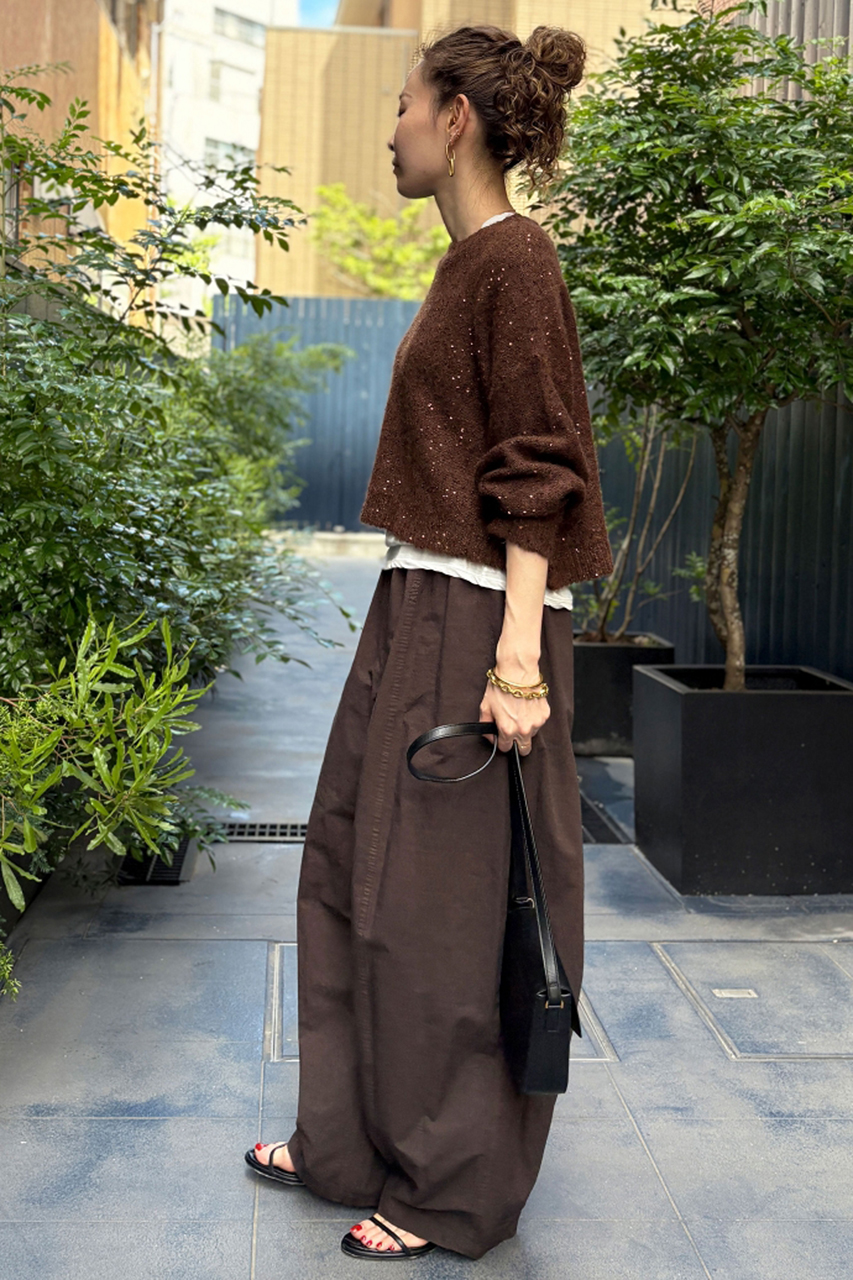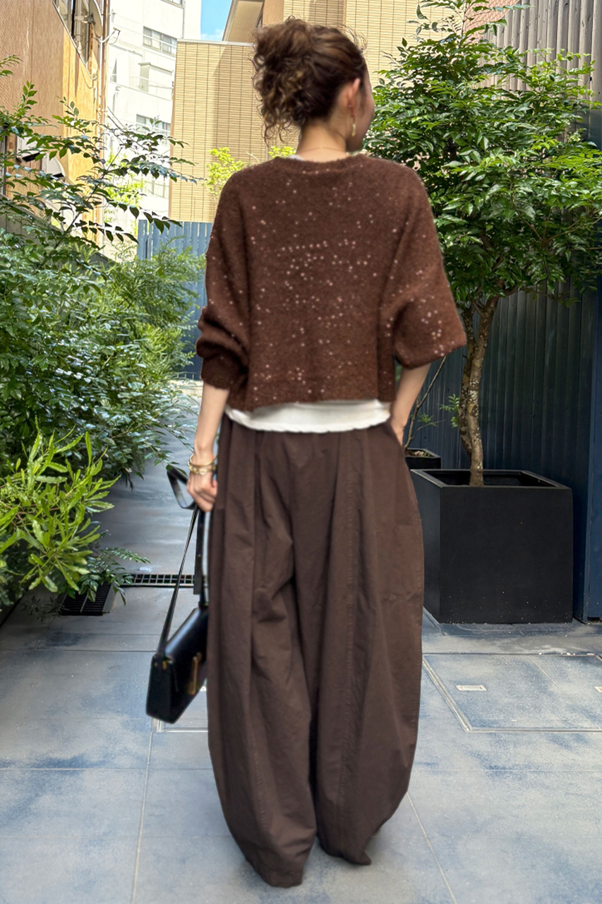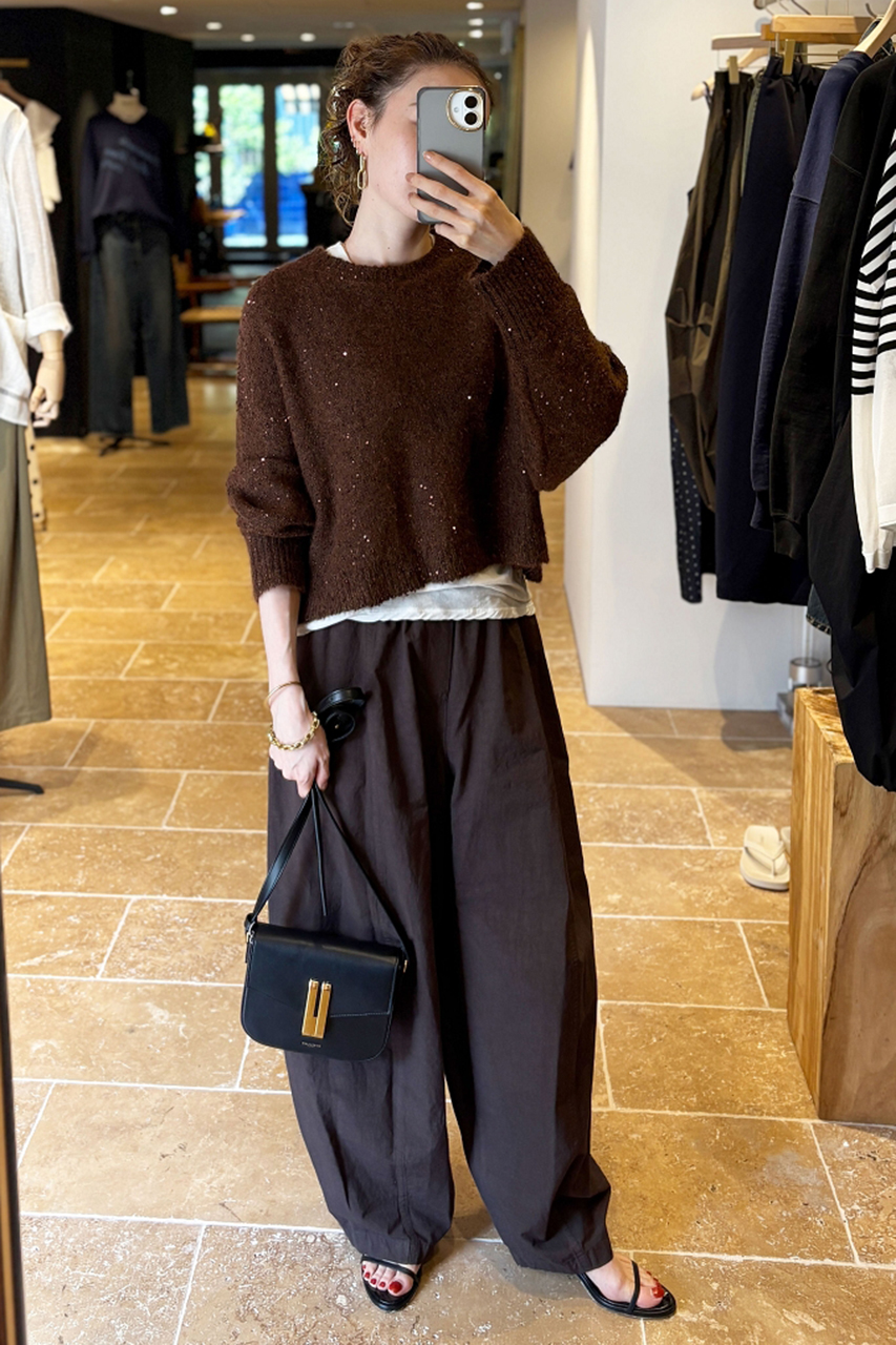 猛暑が続いていますが、秋に向けて素敵なニットが入荷し始めていますよ♪細かなスパンコールが美しく上品なニットは、この秋一推しの一品です。ゆったりとしたサイジングと短めの丈のバランスが絶妙で今年の気分にぴったり。ボリュームパンツとも相性抜群です。個人的にはちくちく感は感じず、快適な着心地でした。ボトムは新色のダークブラウンのコットンリネンドロストパンツ。秋冬も使いやすいシックなカラーで、活躍まちがいなしです。