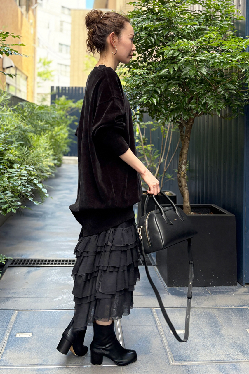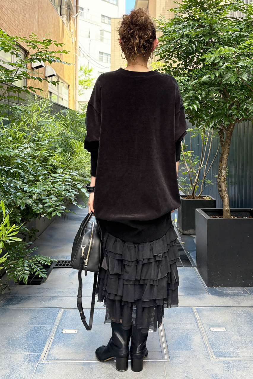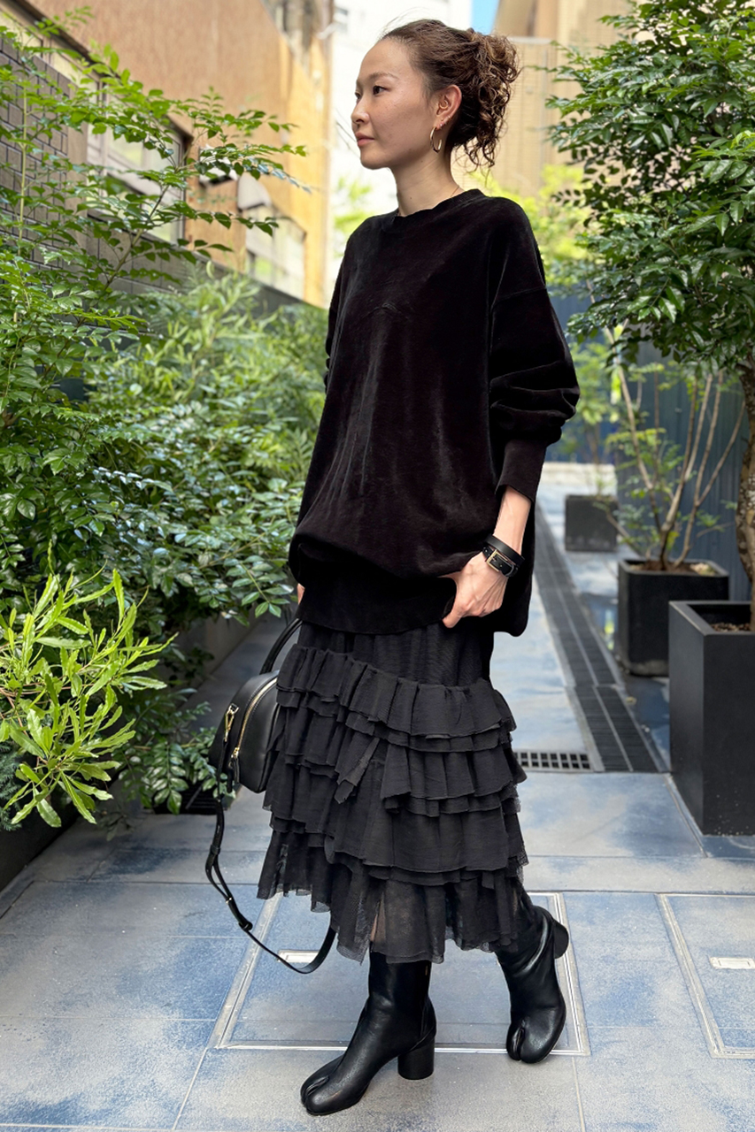 予約から人気のニットベロアチュニック&コットンメッシュスカートが入荷♪ベロアのような滑らかなタッチが上品なニットチュニックは長めの丈でリラックス感のある抜群の着心地。ゆったりオーバーサイズで新鮮なバランスが楽しめます。ワイドパンツやスカートに合わせてした重心のバランスを作るのもオススメ。コットンメッシュスカートは、ボディはシンプルで抑揚を付けたデザイン。シアー感があるのでデニムなどのパンツとレイヤードもおすすめです。