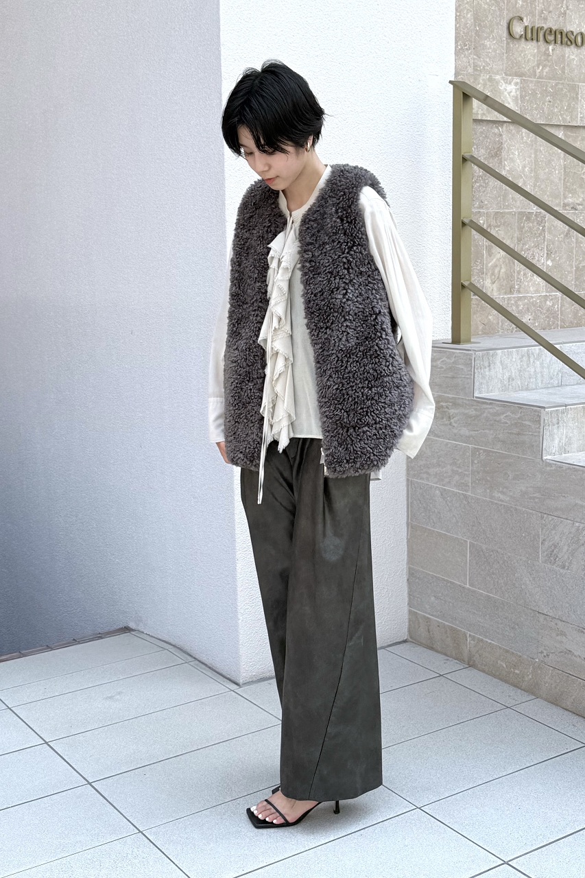 フェミニンな印象のフリルブラウス×ファーベストに、辛口なレザーパンツを合わせてクールなスタイリングにしました♪