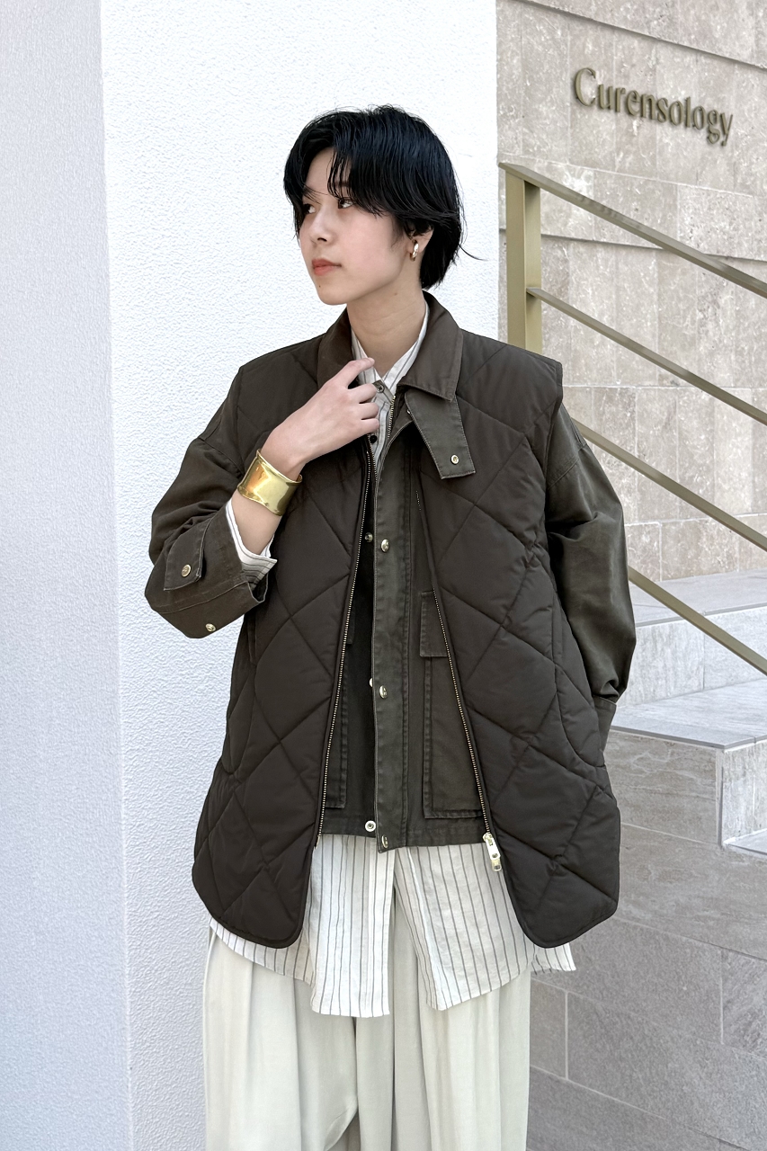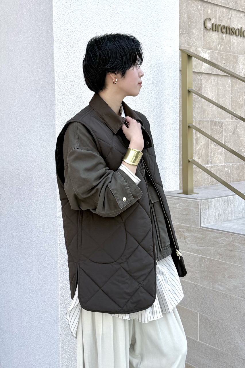 今回はブルゾンの上にキルティングベストを重ねて、新しいバランスを楽しんだスタイリングです。
