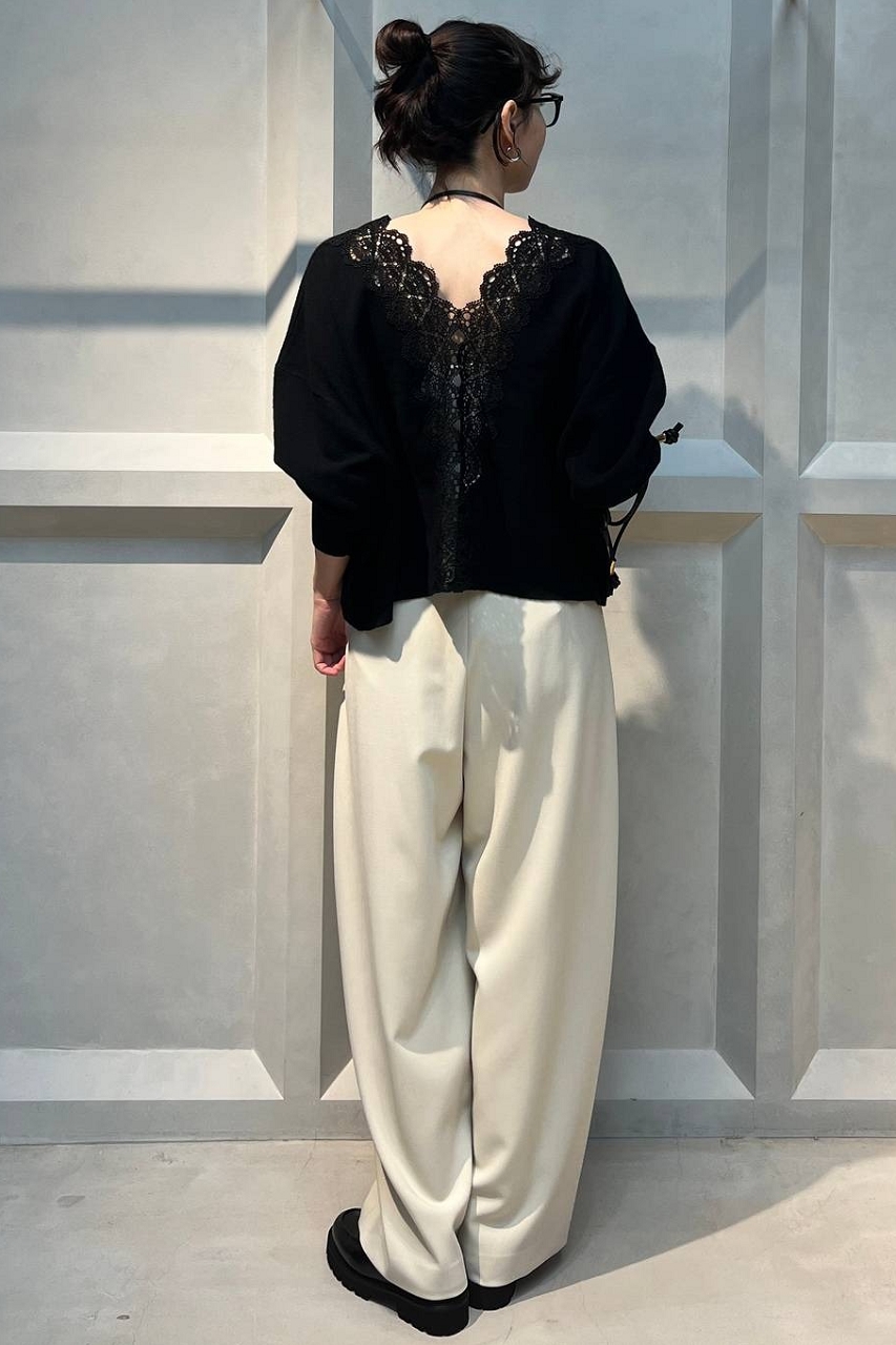 ベロア素材ならではの重厚感と美しい落ち感が、細部までこだわったボリュームのあるパターンをすっきりと見せこなれた印象に。