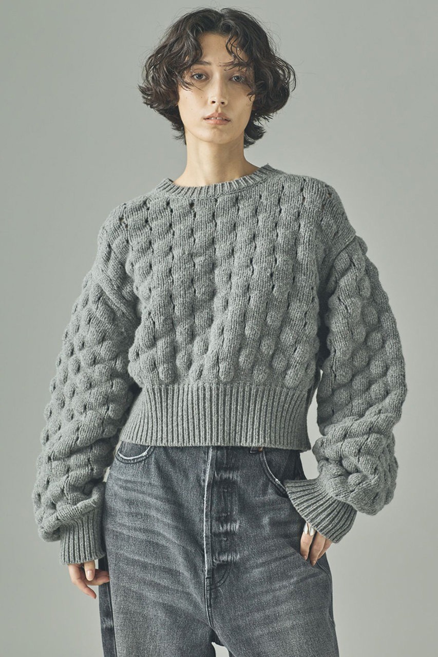 編みのテクニックで凹凸をつけた、表情豊かなデザインニット。
