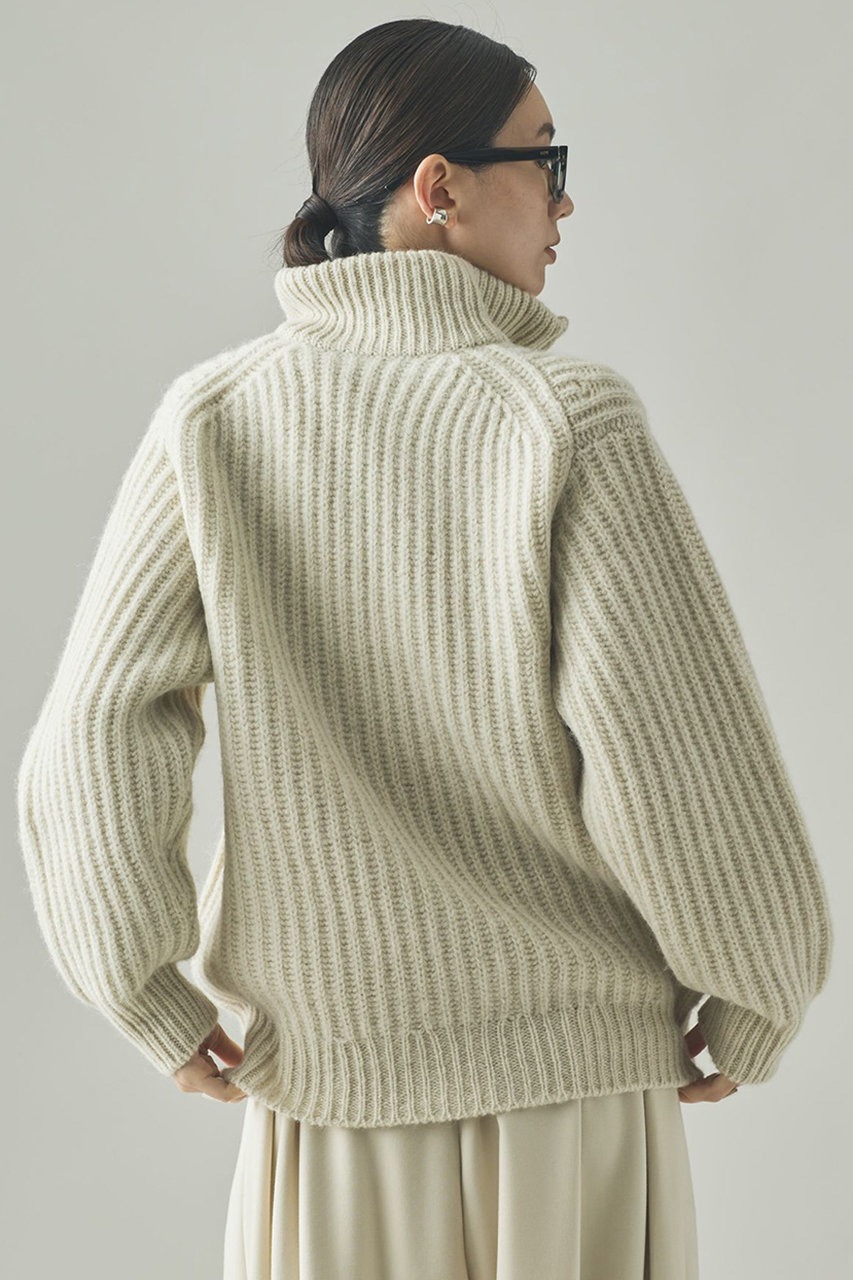 肉厚な3ゲージの畦編みが柔らかな風合いと、ミニマルなデザインが大人の雰囲気を演出。